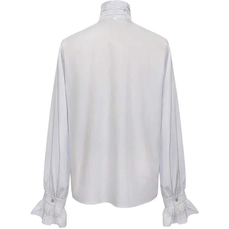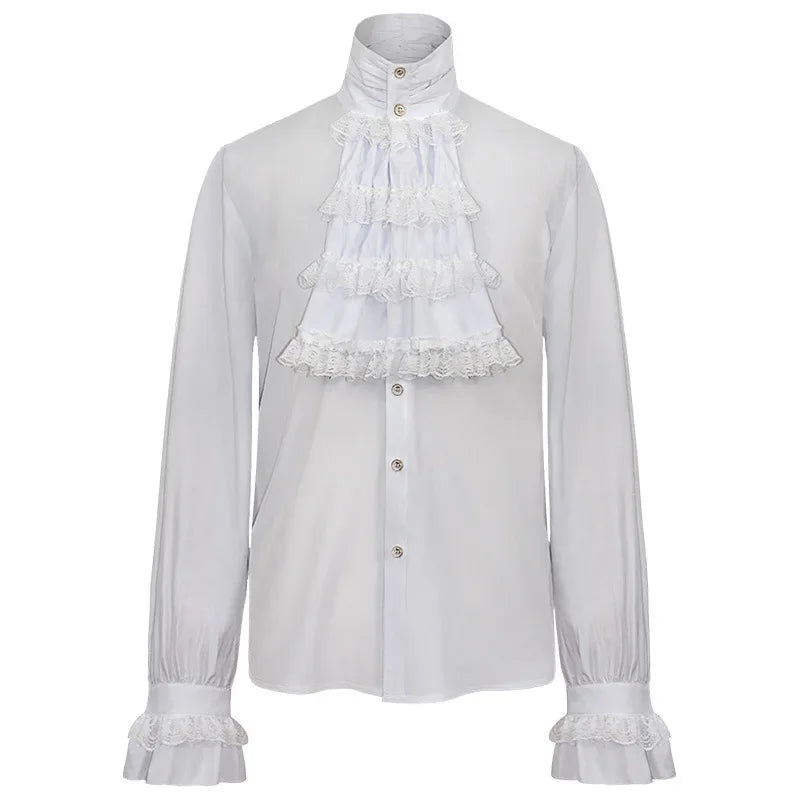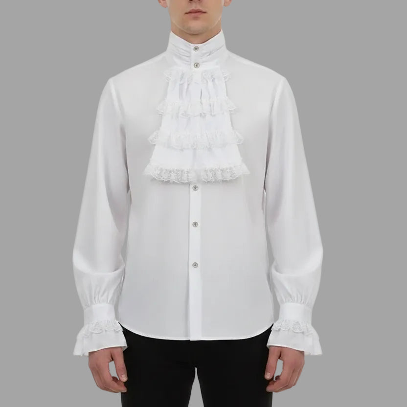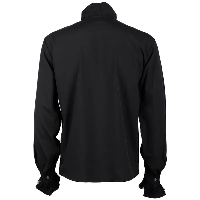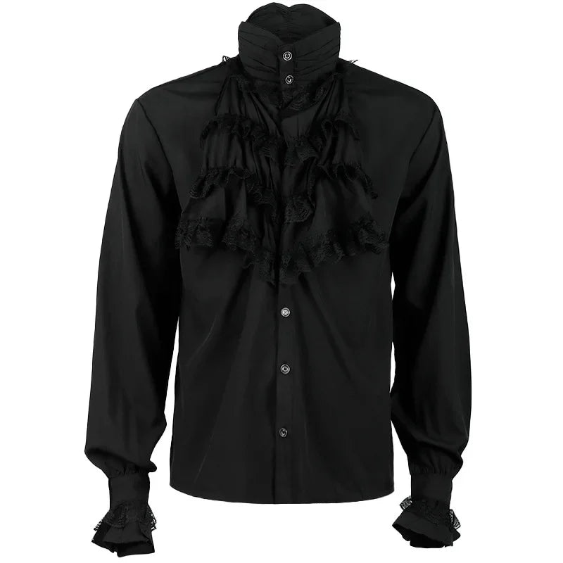 This gothic steampunk shirt blends vintage inspiration with modern versatility. The stand-up collar with ruffled edging frames the neckline elegantly, while the soft pleated front adds depth and movement. Designed as a unisex piece, it adapts seamlessly to different silhouettes and styling choices. Whether worn as part of a costume or as a bold fashion statement, this shirt delivers refined character, dramatic presence, and timeless gothic appeal.