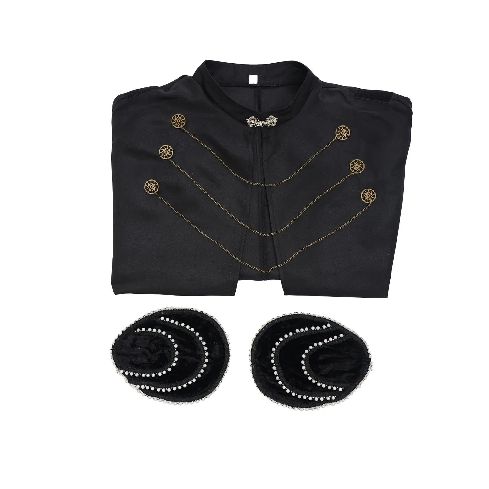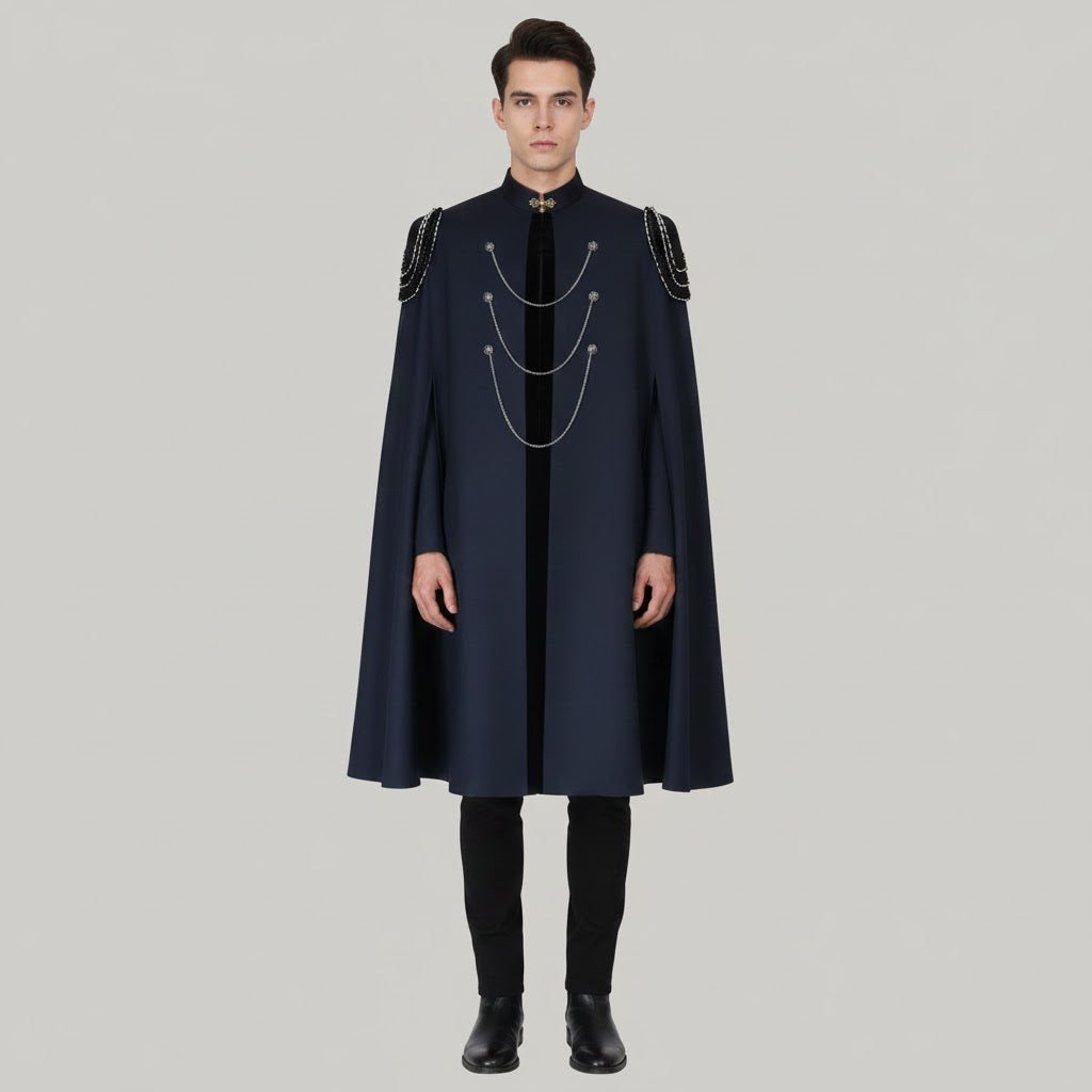 This steampunk chain cape is designed for those who want to command attention the moment they enter a room. The long flowing cut creates a dramatic silhouette, while the metallic chains and gear-inspired details bring a bold industrial edge. Inspired by medieval warriors and steampunk aesthetics, this cape adds authority and mystery to any costume. Ideal for cosplay or fantasy styling, it transforms simple outfits into powerful visual statements.