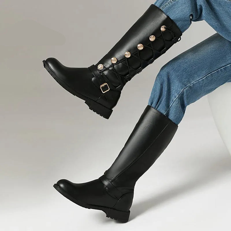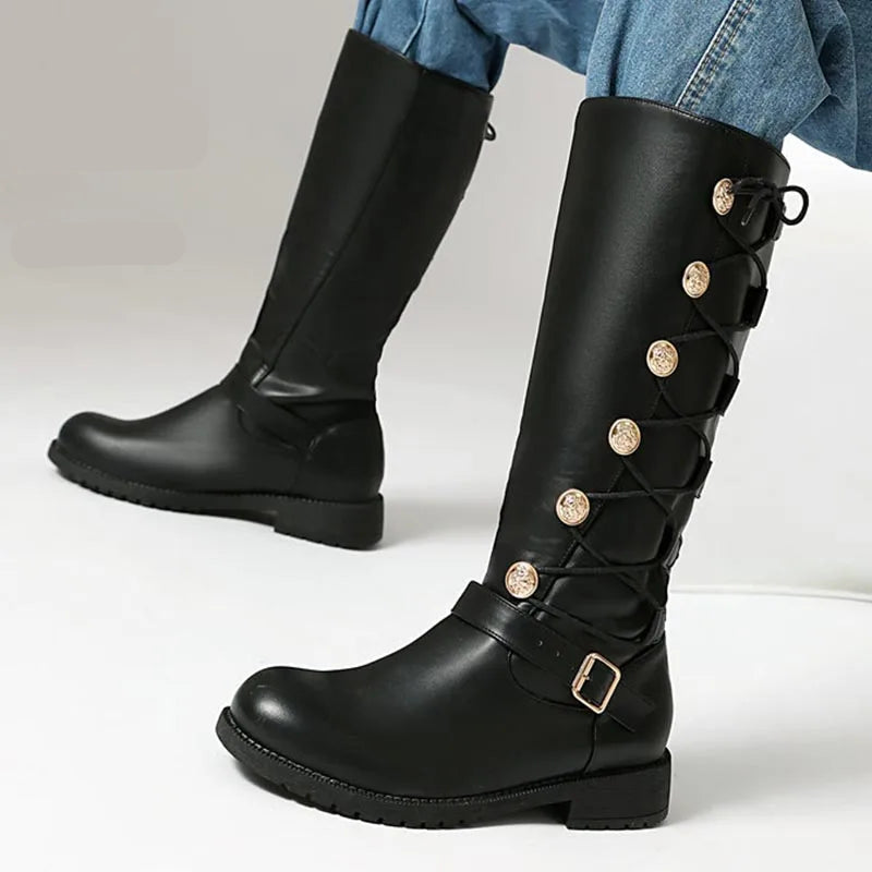 These minimalist lace-up steampunk boots combine vintage British style with modern practicality. Designed with a knee-high structure and round toe, they offer both visual impact and everyday comfort. The PU leather exterior delivers durability, while the low heel and rubber outsole ensure stability with every step. Ideal for casual outfits, alternative fashion, or themed looks, these boots add character without sacrificing comfort during colder seasons.