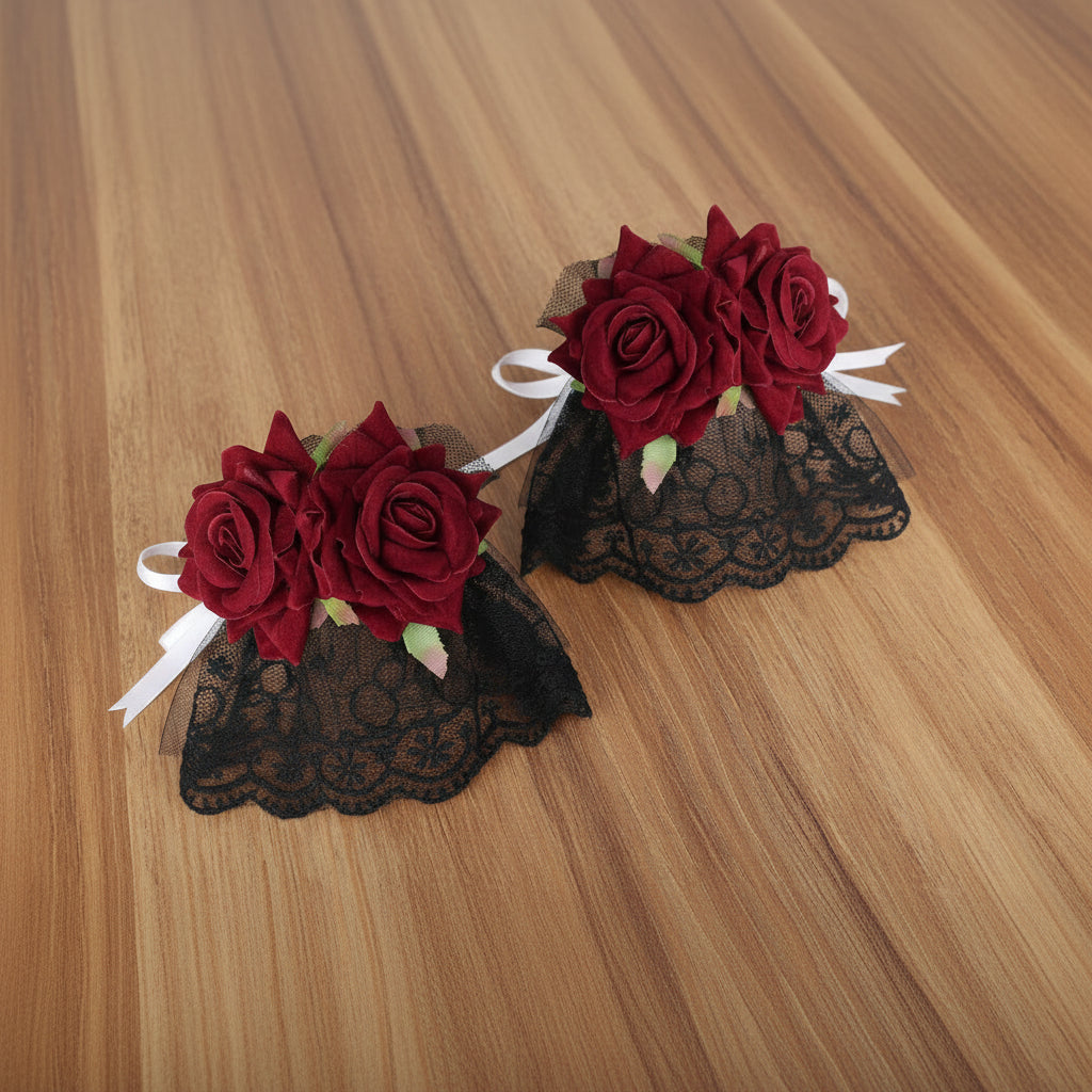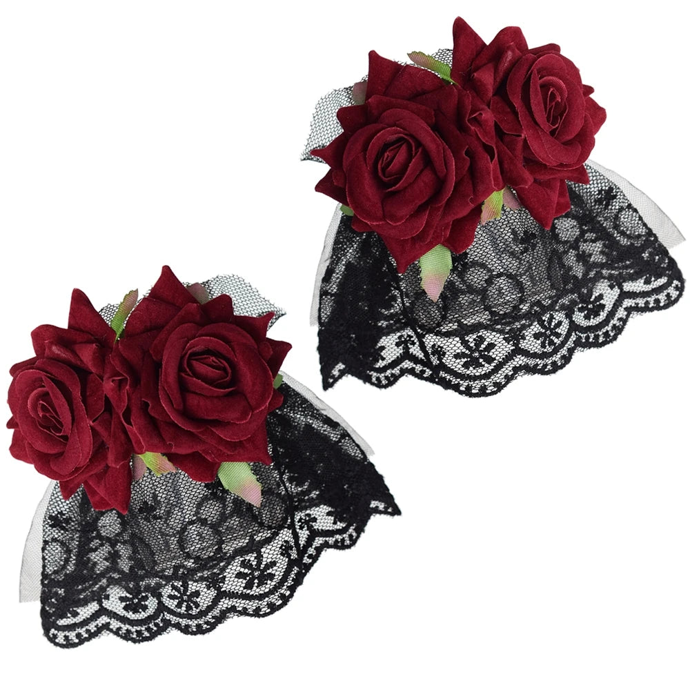 Crafted with detailed floral lace and soft mesh layering, this Victorian wristband highlights refined texture and volume. The carefully shaped roses sit prominently on top, adding depth and dimension to the design. Lightweight yet visually impactful, the bracelet ensures comfort while maintaining its structured aesthetic. Ideal for themed events, cosplay styling, or alternative fashion lovers seeking a distinctive accessory with strong personality.