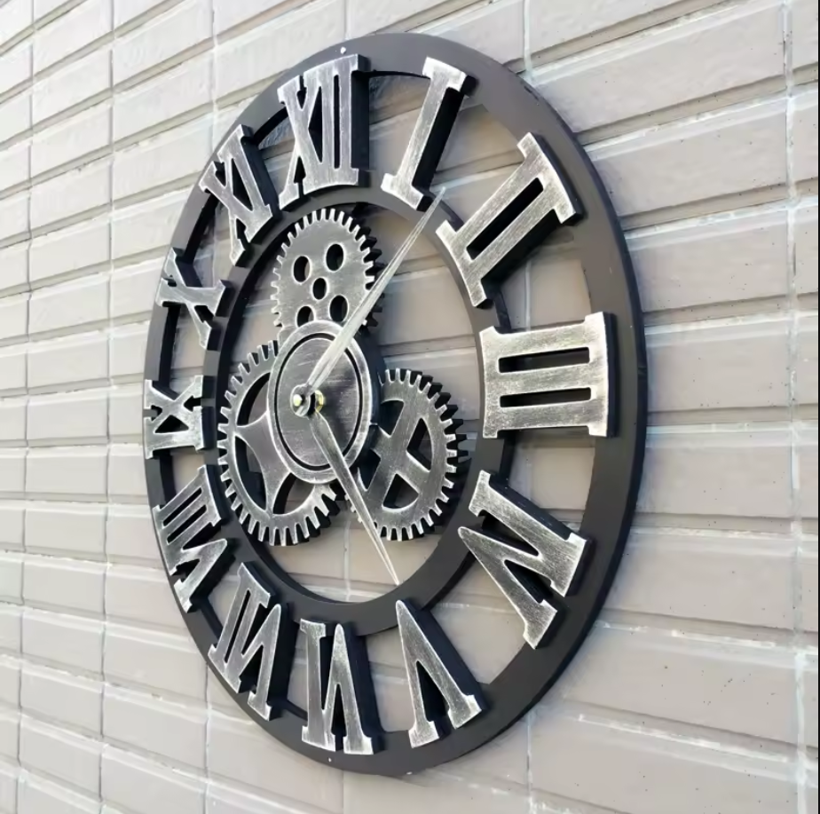 - Enhance your home décor with this large steampunk wooden wall clock, featuring intricate Roman numerals and a unique gear design.
