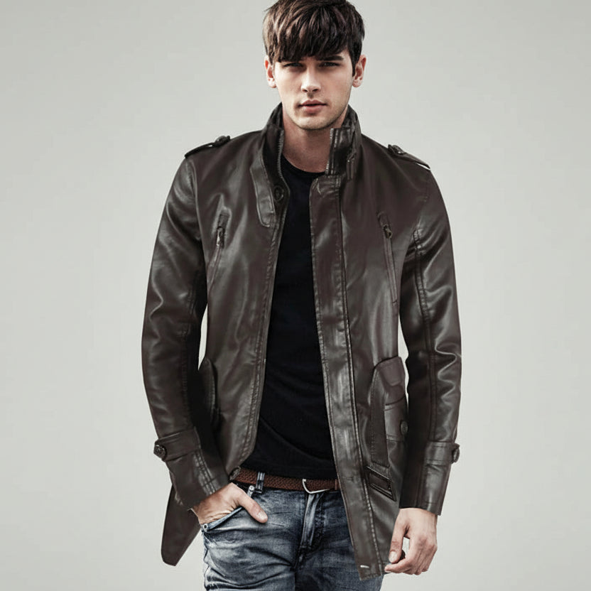 This casual steampunk faux leather jacket is designed for men who value clean lines and confident style. Its structured cut enhances the silhouette while the stand collar adds a bold, contemporary edge. Crafted from durable faux leather and broadcloth, it offers reliable comfort during cooler spring and autumn days. Easy to style with jeans or trousers, this jacket transitions effortlessly from daily errands to casual evenings, making it a versatile essential for a modern wardrobe.