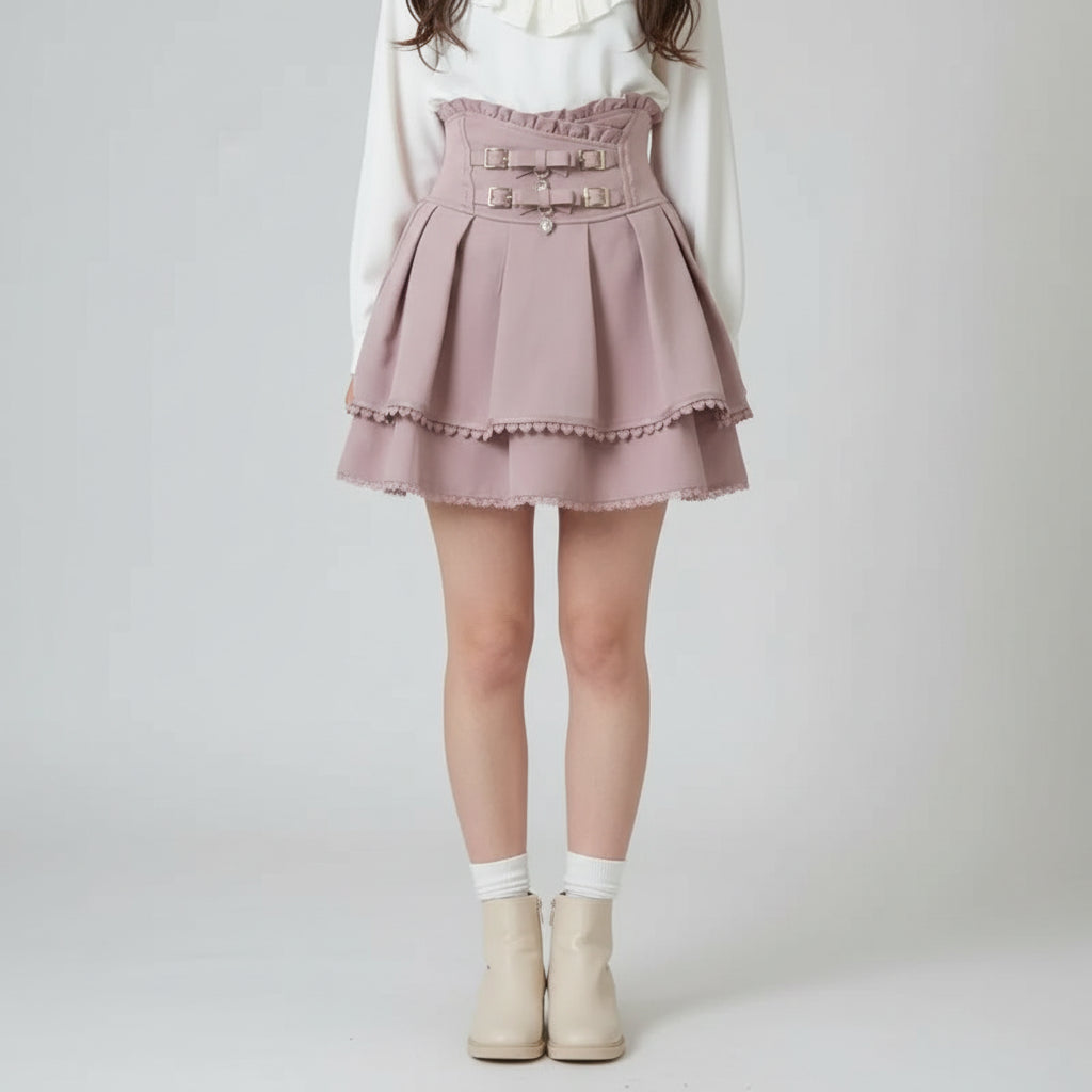 Step into the kawaii fashion world with this double-layered skirt that brings a perfect blend of elegance and playfulness. Designed with intricate lace details and a heart-shaped belt, it offers both comfort and style. Whether you're dressing up for a themed event or just want to add a touch of sweetness to your everyday look, this skirt is the perfect choice for every kawaii lover.
