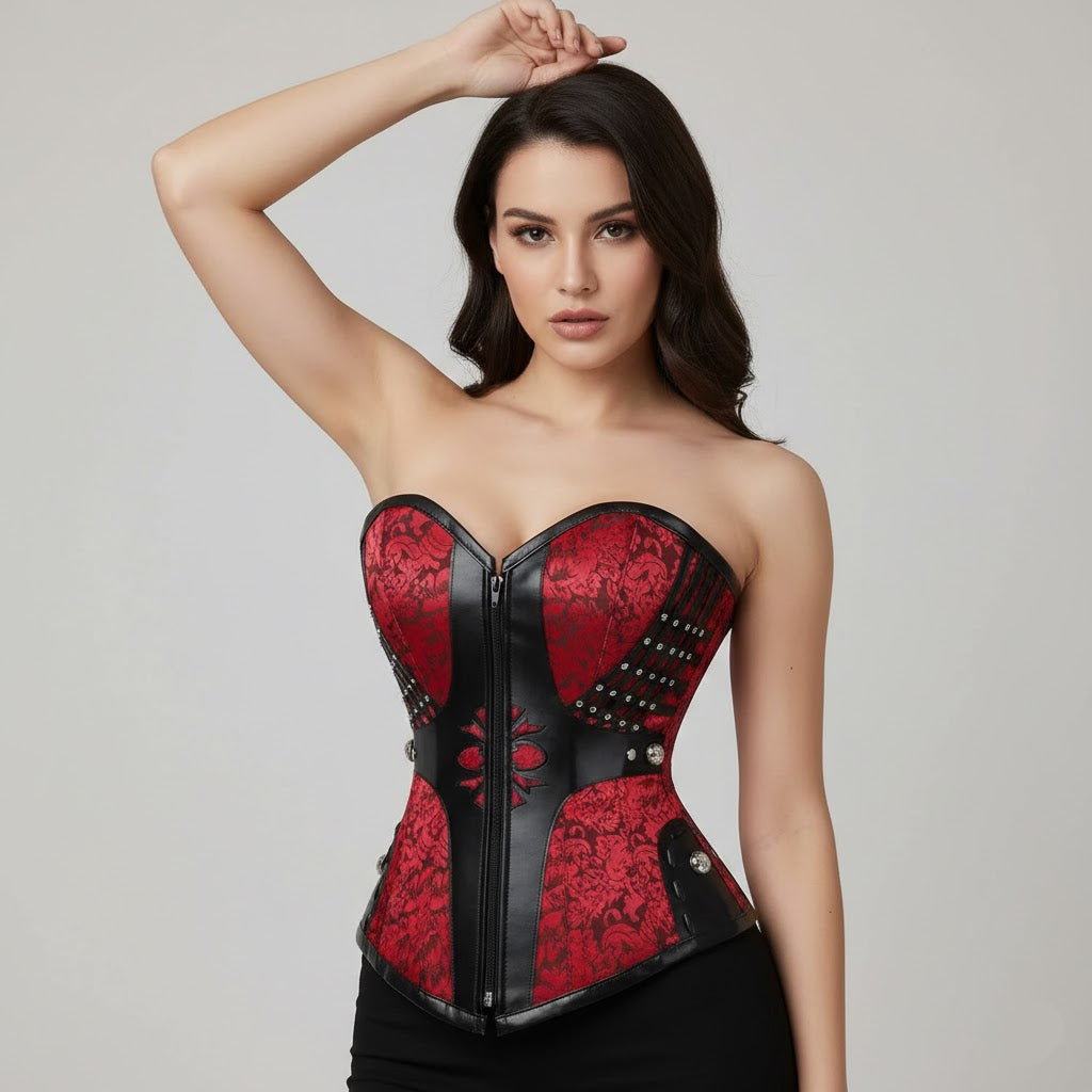 This elegant steampunk bustier corset is crafted to deliver a dramatic silhouette inspired by gothic and Victorian aesthetics. The overbust cut enhances the chest while shaping the waist with precision thanks to its steel boning structure. Rich satin fabric is combined with faux leather details to create contrast and depth. Metal accents and embossed patterns elevate the design, making it ideal for bold fashion statements, themed events, or standout evening looks.