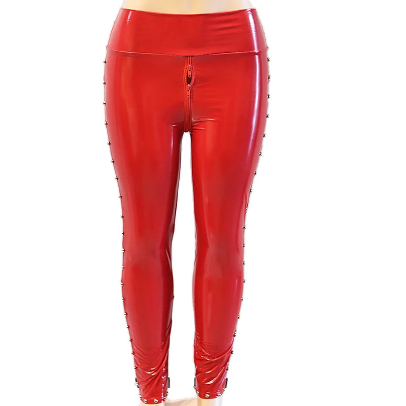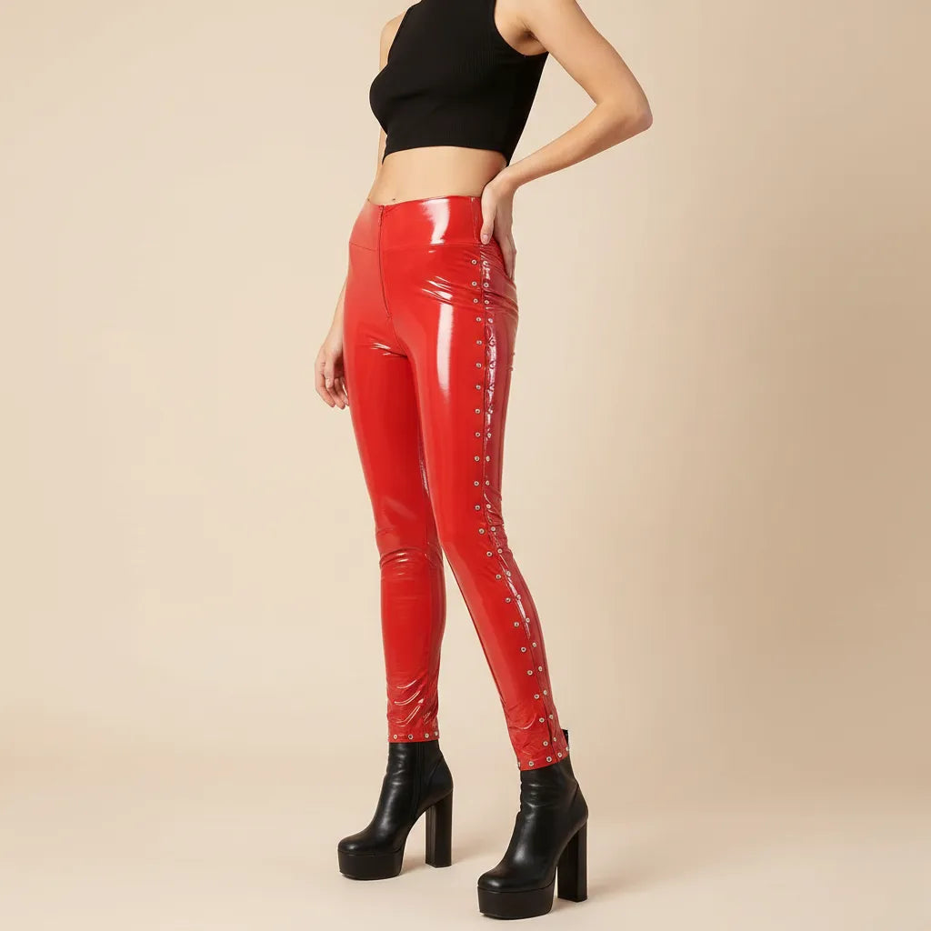 - Show off a bold style with these glossy riveted steampunk leggings, perfect for adding an industrial and mechanical touch to your outfits while staying comfortable.