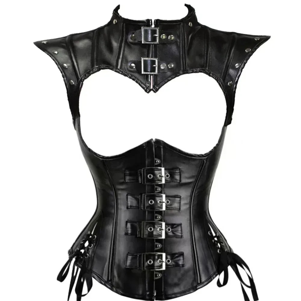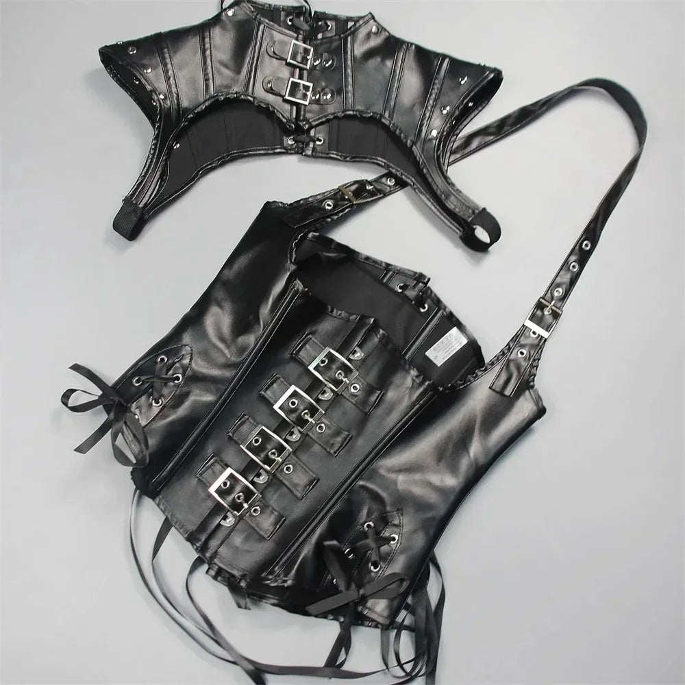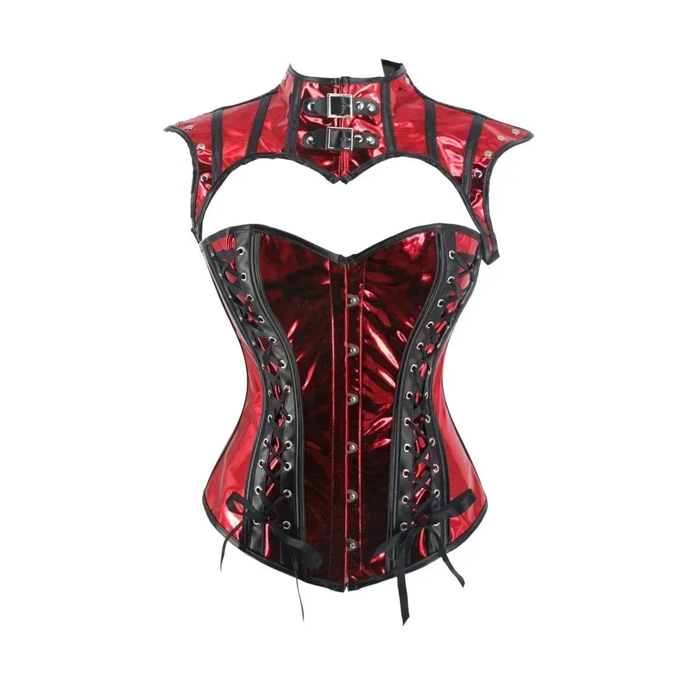 This steampunk faux leather corset is designed to deliver strong visual impact and confident structure. Its sculpted shape enhances the waist while the shoulder detailing creates a powerful silhouette. Metallic buckles and lace-up sides add a distinctive gothic and pirate-inspired edge. Whether styled over clothing or worn as a statement piece, this corset brings vintage character and modern attitude together effortlessly.