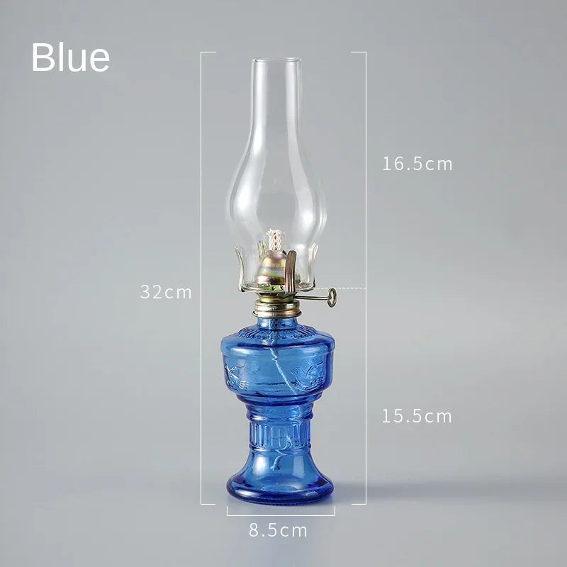 This retro glass oil lantern combines authentic craftsmanship with a strong decorative presence. Its transparent glass chimney enhances the flame while the colored base adds depth and character. Designed for indoor ambiance, it creates a soft and calming light perfect for cozy evenings or styled decorations. The metal burner allows precise flame control, offering both functionality and charm. Its vintage silhouette makes it a standout piece for rustic, industrial, or steampunk interiors.