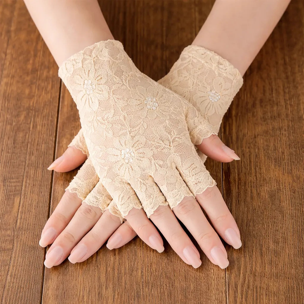 - Comfort and delicacy with these half-sleeve lace gloves adorned with pearls.