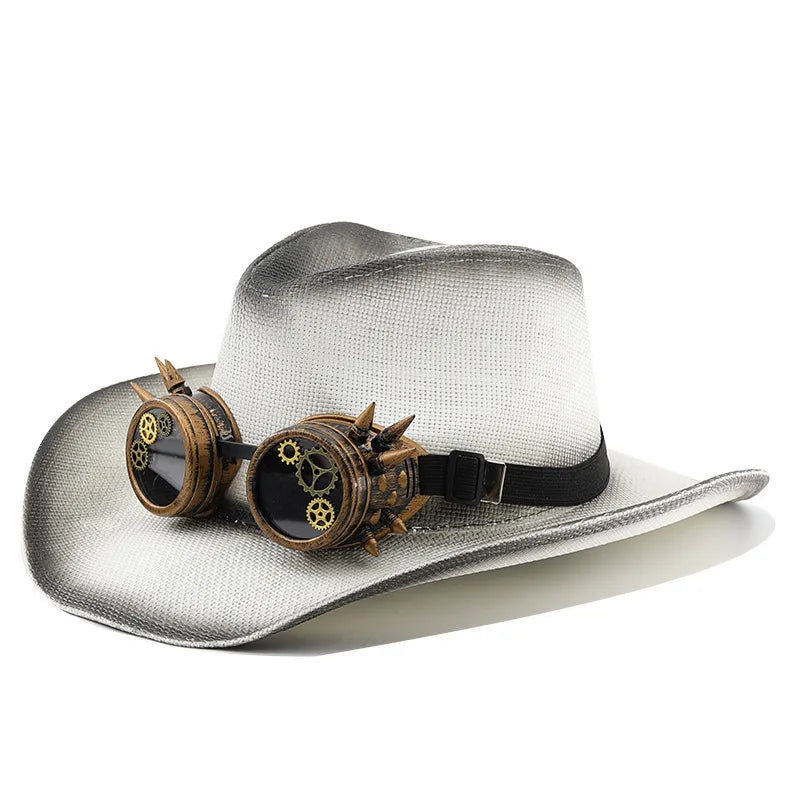 Crafted for spring and summer use, this cowboy hat offers a lightweight feel and balanced structure. The gradient color effect delivers a refined yet playful appearance, while the attached goggles add character and originality. Designed to fit most adults comfortably, it adapts easily to daily wear, vacations, and themed events. This hat blends seasonal comfort with distinctive steampunk style.