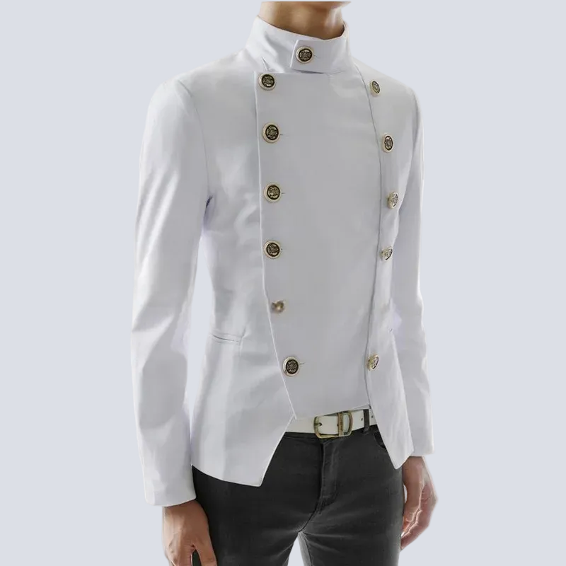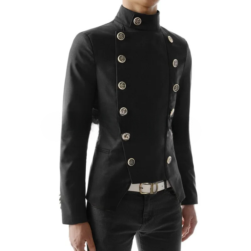 Assert a Noble Presence with the Double-Breasted Medieval Steampunk Jacket in a Crossed, Authoritative Style