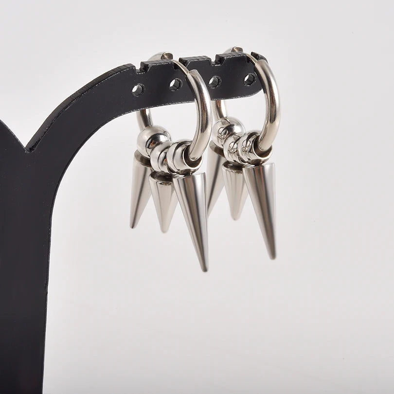 These earrings combine thick metallic hoops with pointed cone-shaped pendants, creating a bold and structured silhouette. The geometric volumes deliver strong presence, while the polished surface intensely reflects the light. The contrast between the circular hoop and the sharp spikes enhances the visual impact. The overall design evokes a confident industrial spirit, ideal for completing a modern alternative or urban look.