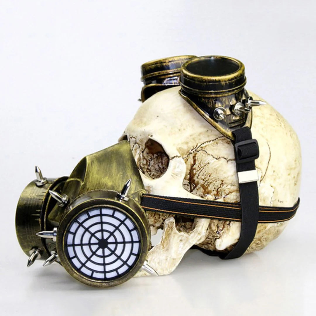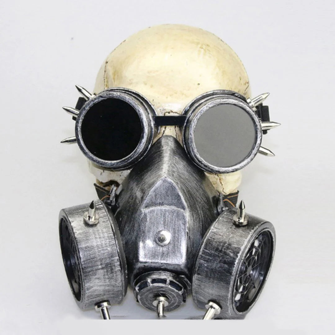 This retro steampunk gas mask with goggles stands out with its rugged look and aesthetic inspired by reimagined vintage equipment. The integrated round goggles dominate the design, reinforcing its strong vintage identity. Symmetrical side filters add balance and visual power, while aged metallic finishes enhance the distressed effect. The overall look evokes an alternate universe where period technology and mechanical imagination collide with intensity.