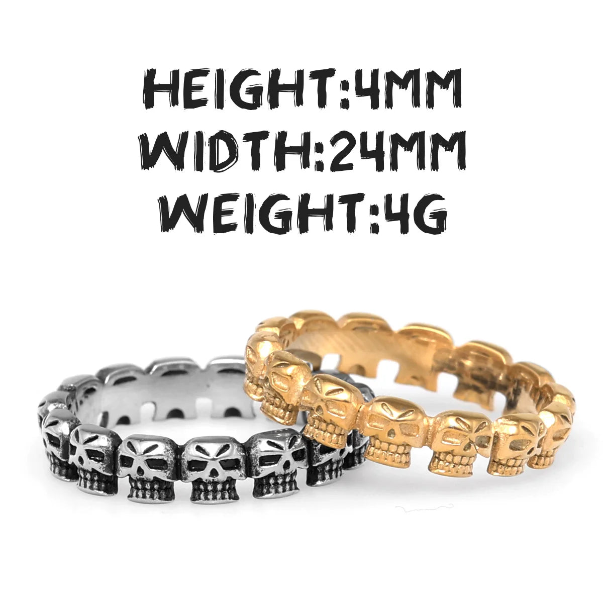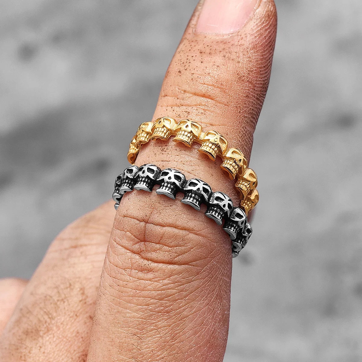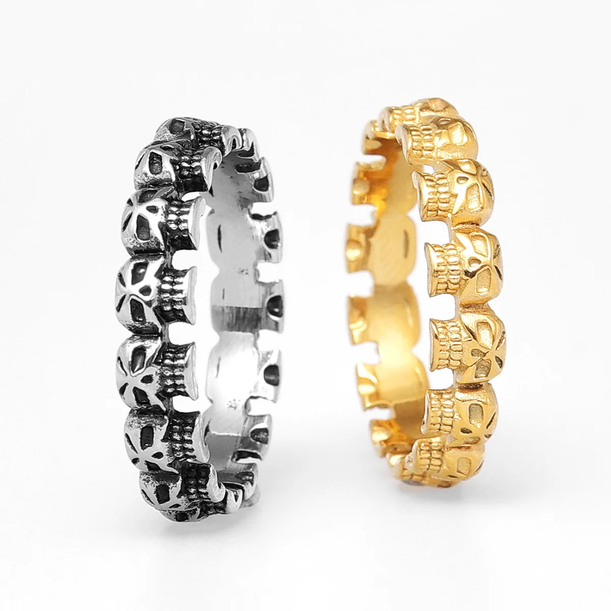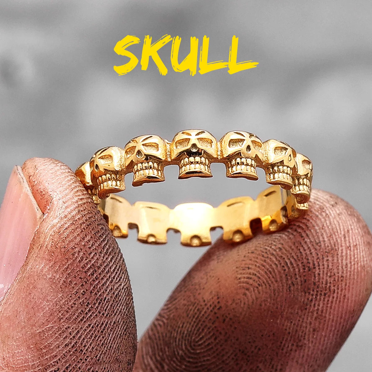 This thin skull ring offers a refined take on gothic jewelry. The evenly spaced miniature skulls create a continuous pattern that blends edgy character with minimalist proportions. Crafted from durable 316L stainless steel, it maintains its shine without fading or rusting over time. The slim 4 mm width ensures a comfortable fit, making it ideal for everyday wear while still delivering a confident punk-inspired presence.