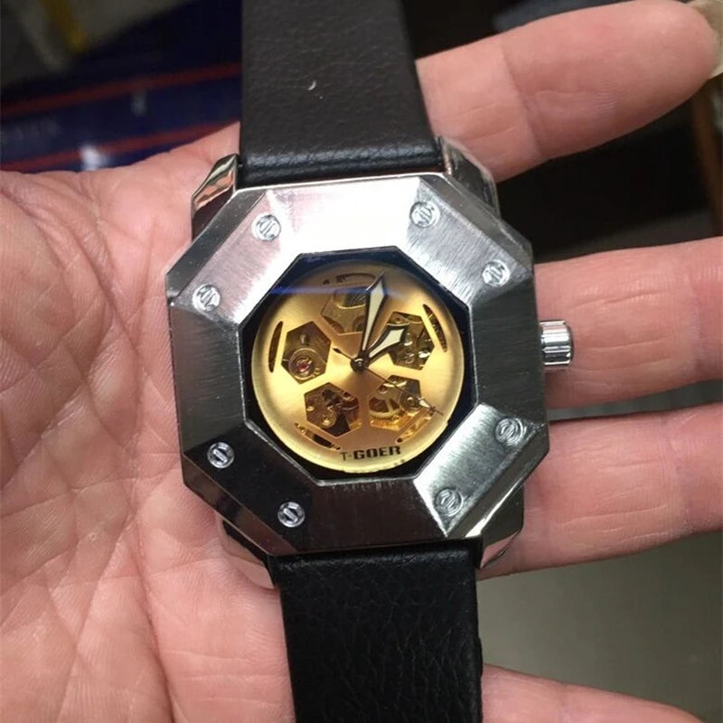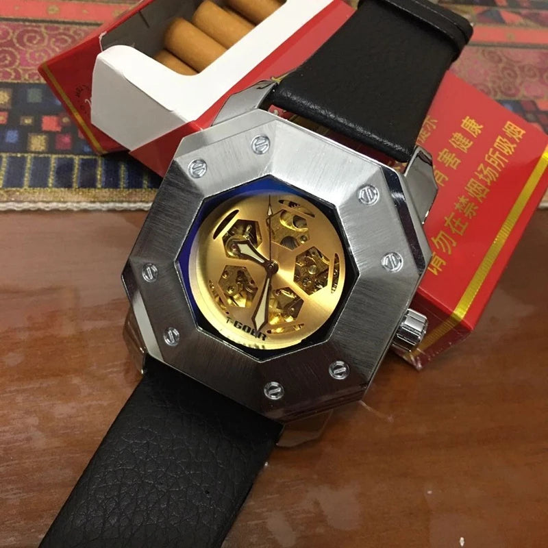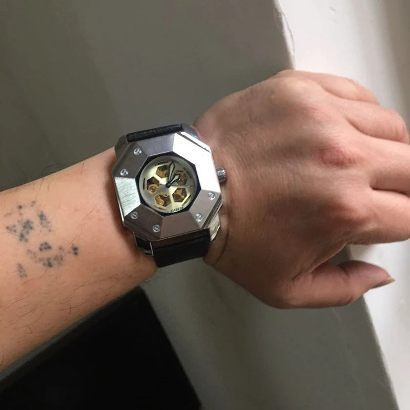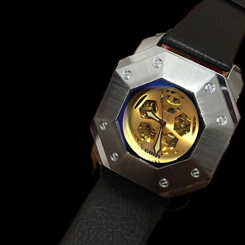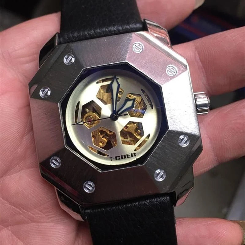 This men’s geometric steampunk watch stands out through its football-inspired hollow dial and angular case construction. The open design exposes the mechanical movement, transforming timekeeping into a visual performance. Every detail reflects energy, precision, and modern masculinity. Designed for those who prefer expressive accessories, this watch enhances streetwear, casual outfits, and statement looks with a powerful blend of sport influence and industrial character.