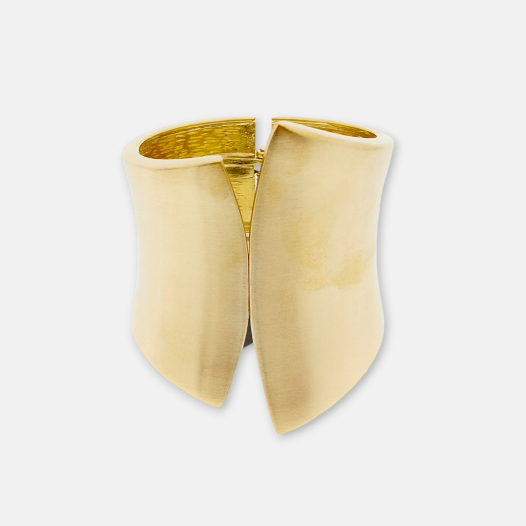 Crafted from high-quality alloy, this bracelet is built to withstand daily wear while maintaining its radiant gold finish. The sturdy hinge clasp ensures secure fastening and effortless opening, making it practical as well as elegant. The smooth interior enhances comfort for extended wear, while the brushed exterior resists visible marks. Easy to maintain and timeless in appeal, this cuff blends durability with sophisticated modern design.