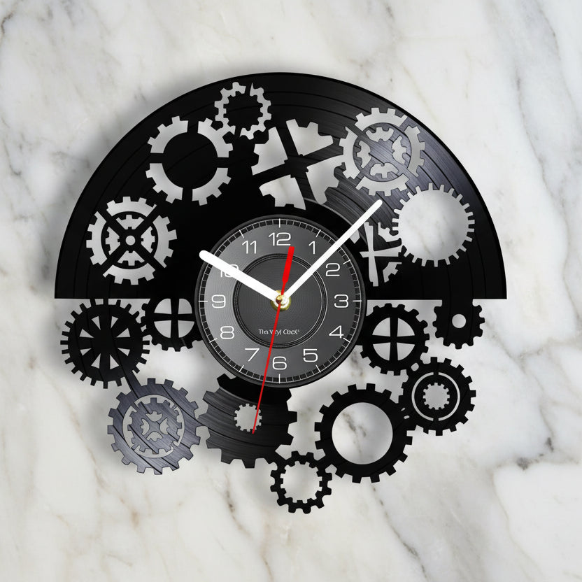 - Bring retro charm and modern style to your space with this vintage vinyl record gear clock, a perfect blend of eco-friendly design and artistic functionality.