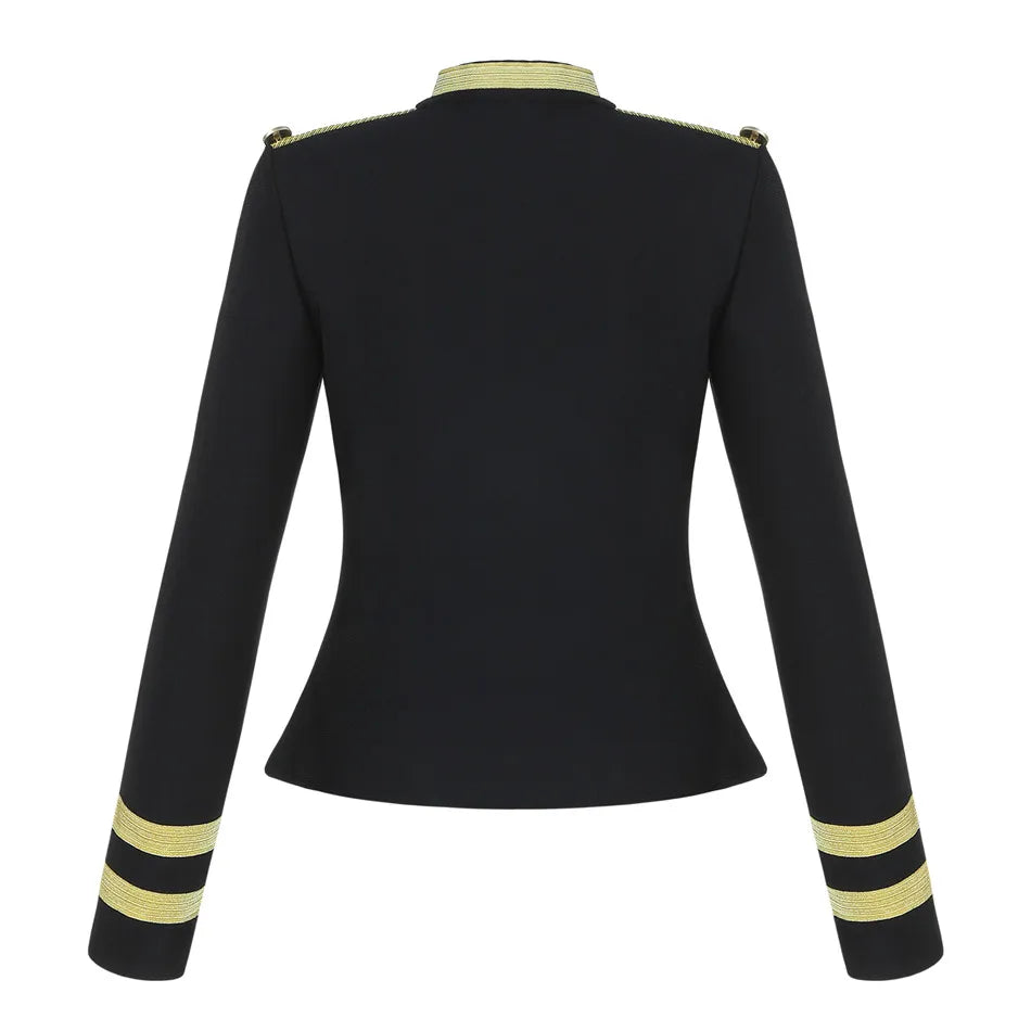This black and gold steampunk jacket is designed for women who embrace strong silhouettes and bold fashion statements. Inspired by British military aesthetics, it features a structured fit that enhances the waist while elongating the torso. Gold rope-style accents and decorative buttons add a luxurious contrast to the deep black fabric. The fitted cut creates a confident, feminine look that transitions effortlessly from streetwear to statement evening wear, making it a standout piece in any alternative wardrobe.