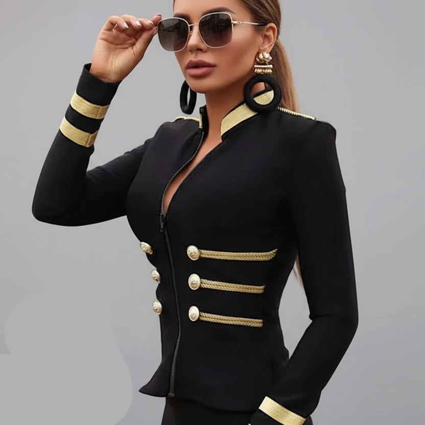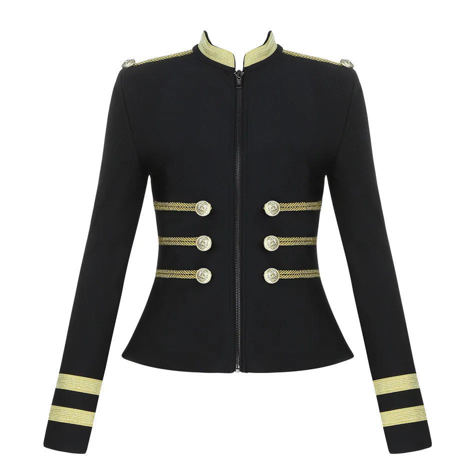 - This jacket sculpts your figure while delivering a powerful, elegant military look.