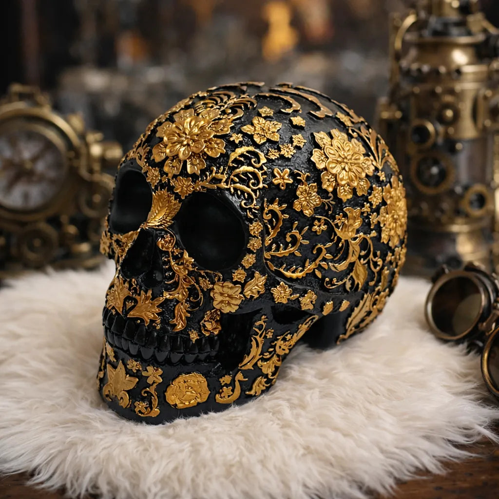 This sculpture stands out with its intense black base covered in finely applied gold patterns. The floral ornaments extend across the entire surface, creating a dense and structured visual effect. Each element appears precisely engraved, adding depth and character to the whole piece. The contrast between dark tones and gold finishes enhances the skull’s decorative presence in both modern and vintage interior spaces.