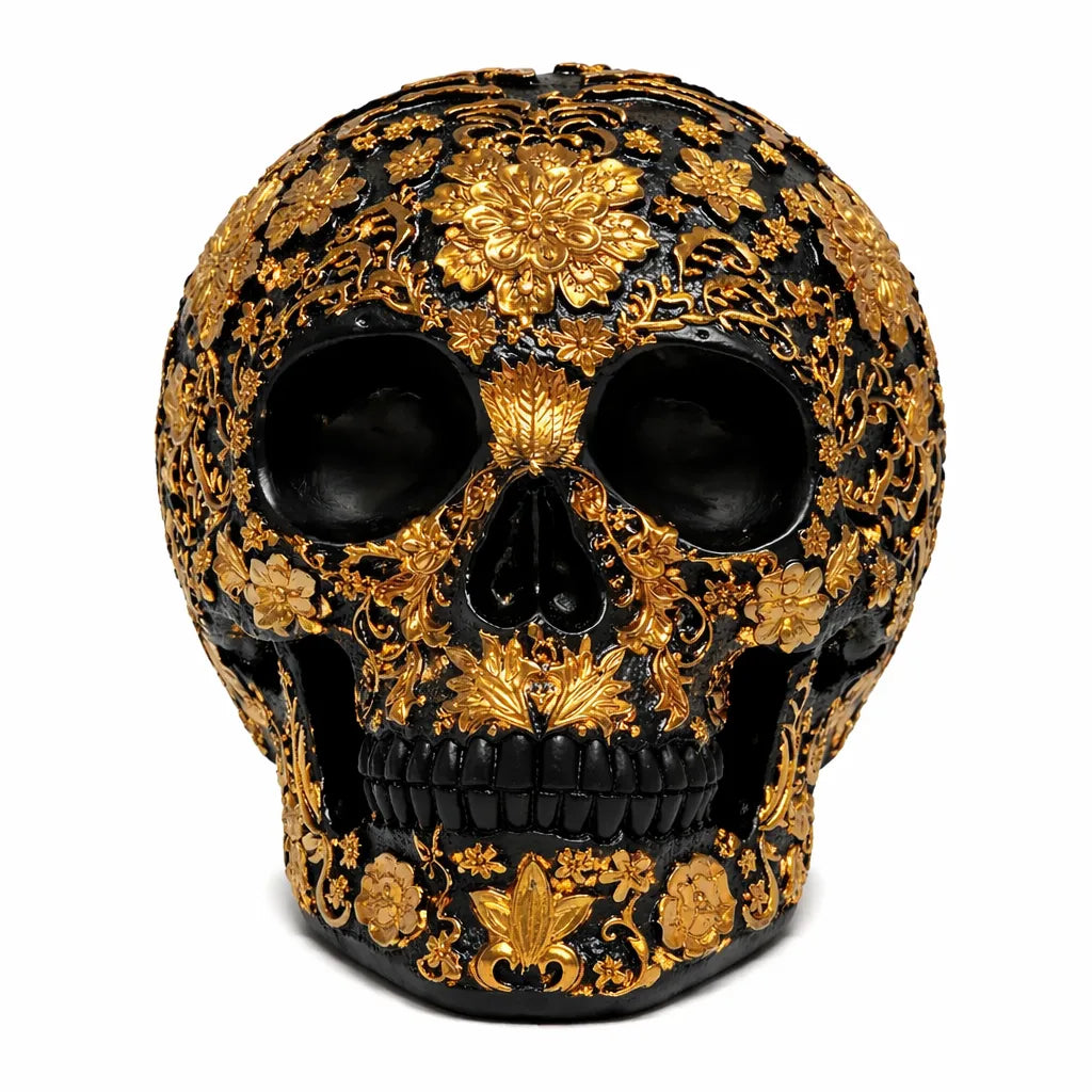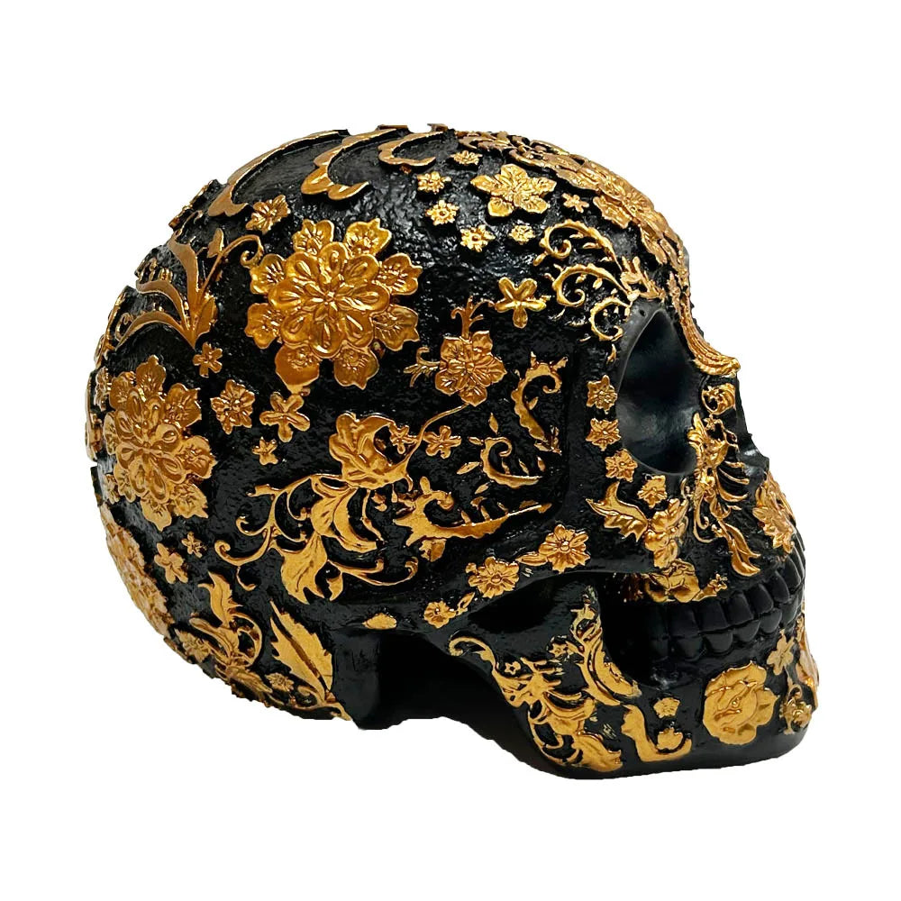- The skull features a deep black base with raised gold patterns.