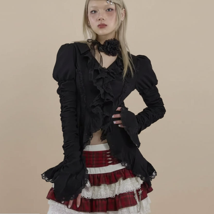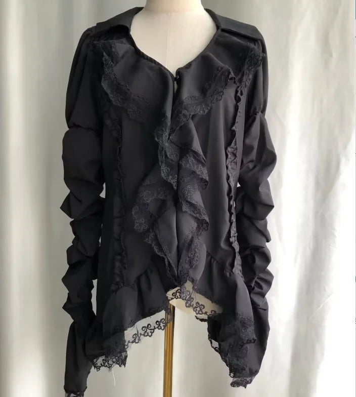 This steampunk blouse is designed to make a statement. Combining vintage Y2K emo elements with a modern grunge flair, it features patchwork lace, an asymmetric hem, and flare sleeves for a standout look. The premium fabric blend provides comfort, while the versatile black color works with denim, leather, or skirts. Whether you're layering for fall or spring or wearing it standalone, this blouse is perfect for concerts, casual outings, or themed parties.