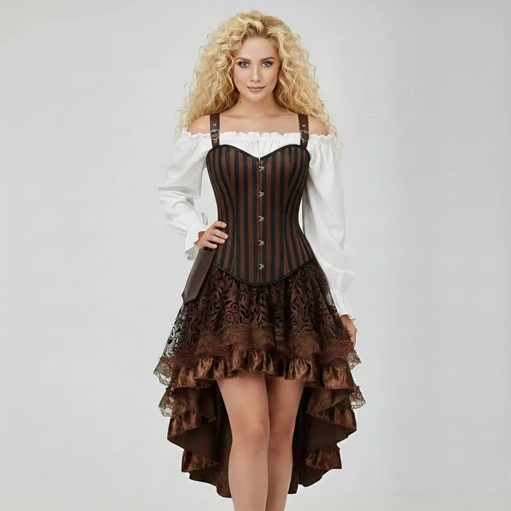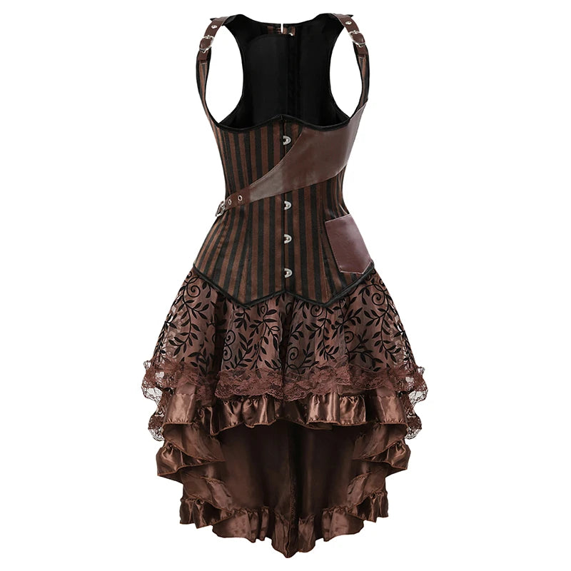 - Assert your retro elegance with the Brown Striped Steampunk Dress, a striped gown with Victorian charm that reveals a bold and timeless style.