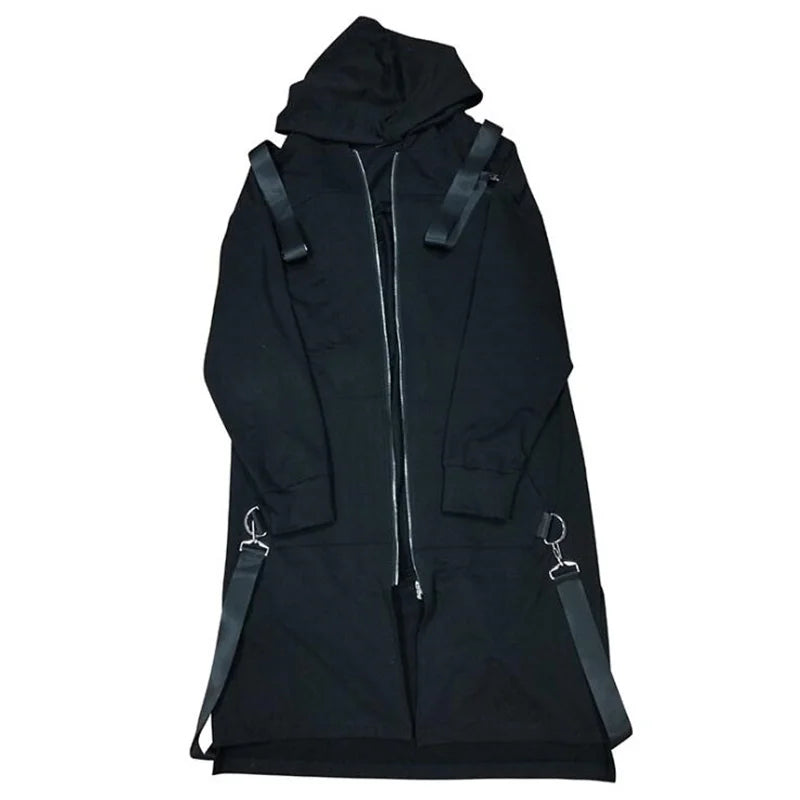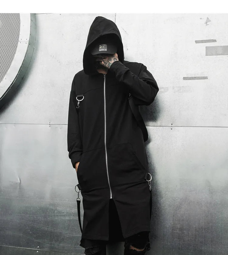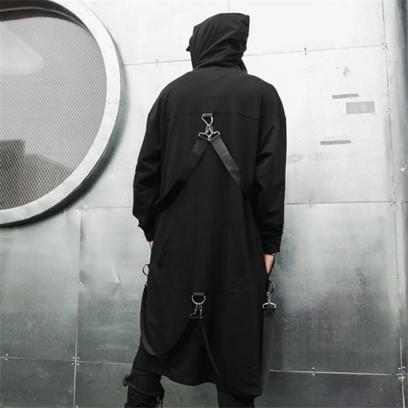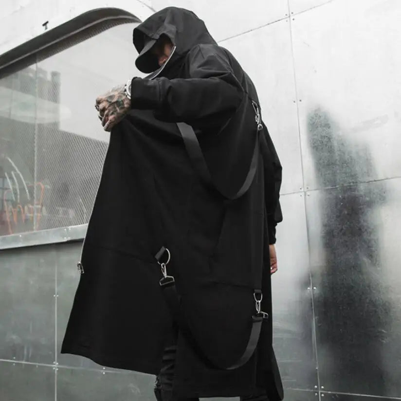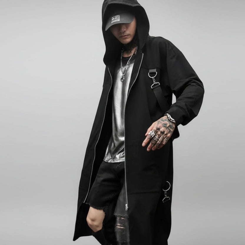 A long hooded coat designed for modern punk and steampunk styleThis hooded trench coat is crafted for those who embrace alternative fashion and bold identity. Its extended length and structured lines create a striking silhouette, while the deep hood adds intensity and mystery. Inspired by punk rock and steampunk culture, the metal rings and ribbon details enhance its raw aesthetic. Ideal for DJs, performers, or streetwear enthusiasts, this coat transforms any outfit into a powerful statement piece.