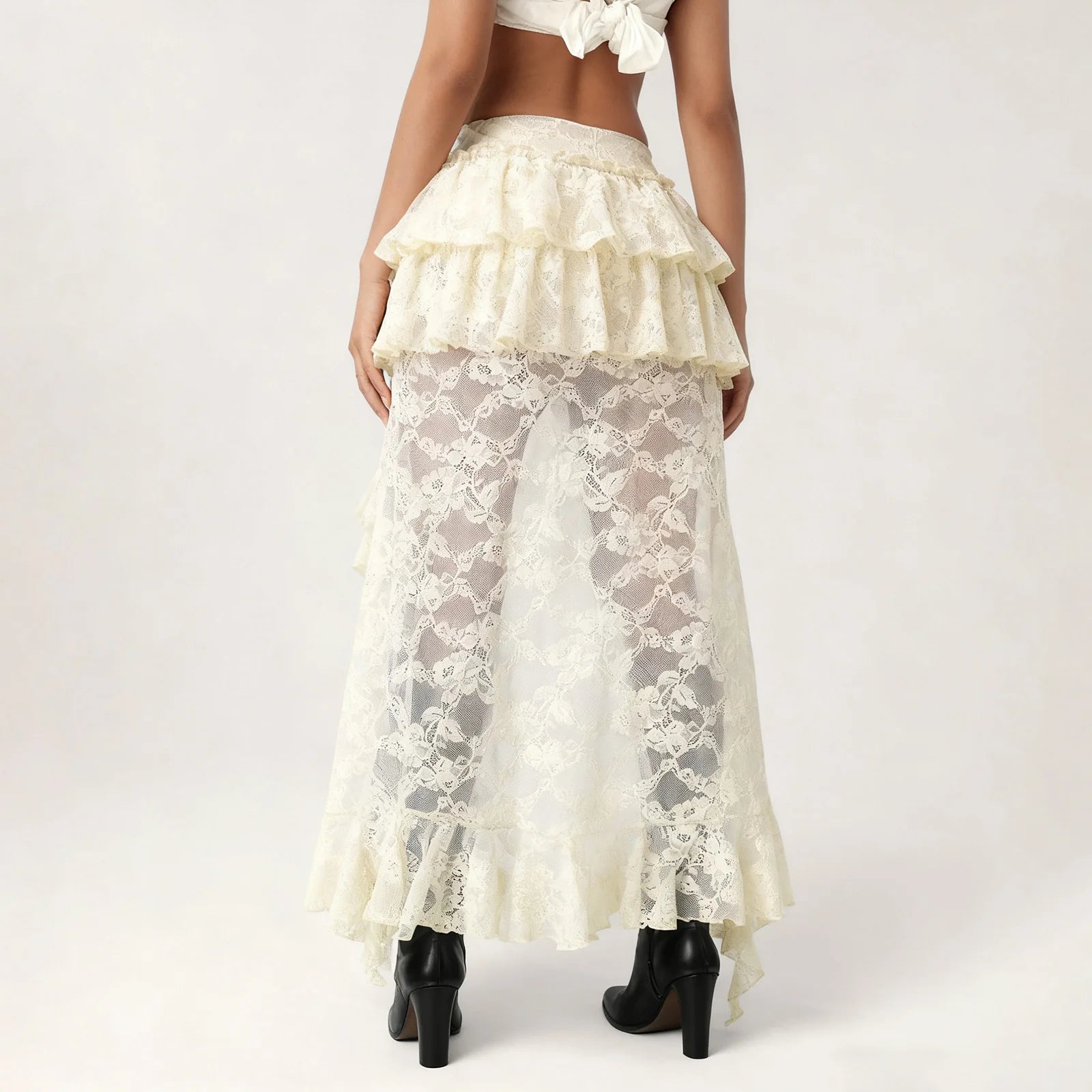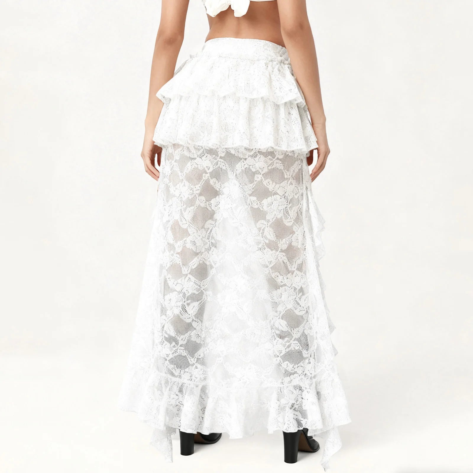 This layered ruffle skirt combines soft lace textures with a bold high-low silhouette to create a modern steampunk-inspired look. The tiered construction adds volume without heaviness, while the floral lace pattern brings elegance and depth. Its elastic waistband ensures easy wear and a flattering fit across different body shapes. Designed to pair effortlessly with boots, crop tops, or statement belts, this skirt becomes a versatile centerpiece for expressive and fashion-forward wardrobes.