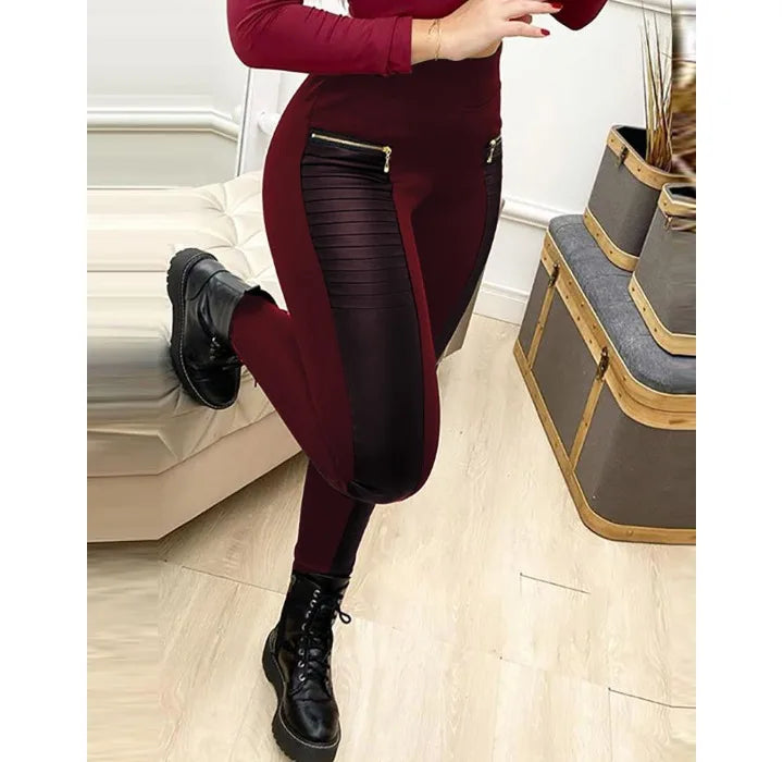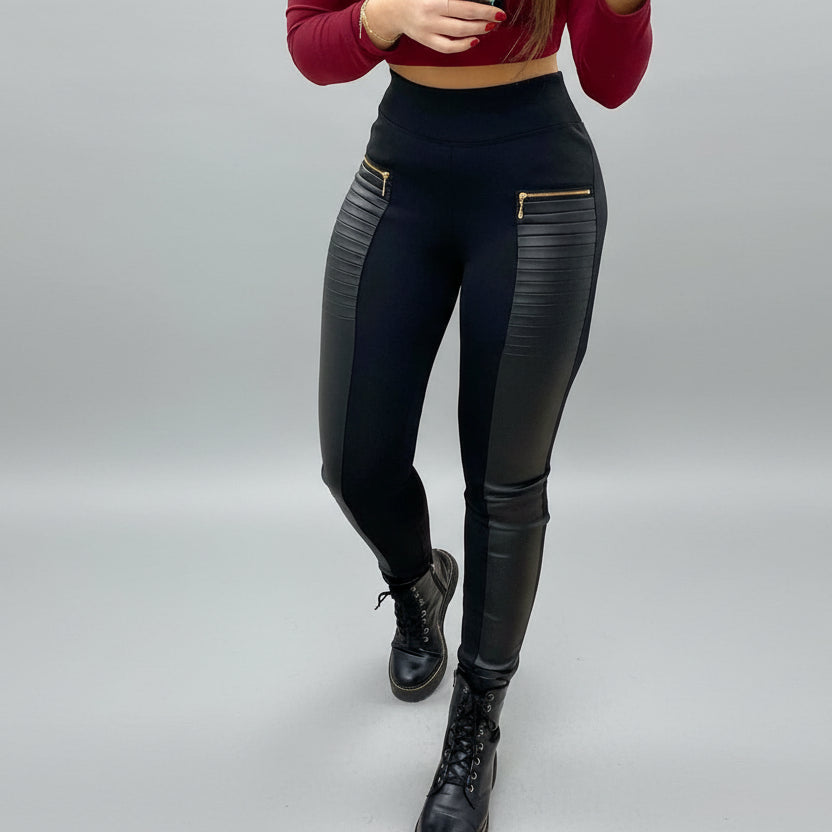 These skinny pants are designed to highlight the natural curves of the body while offering everyday comfort. The slim pencil cut creates a clean and elegant silhouette, enhanced by leather-effect side panels that add structure and contrast. The high waist smooths the midsection and elongates the legs, making these pants ideal for both professional and casual outfits. Easy to pair with heels, boots, or sneakers, they deliver a confident and modern look.
