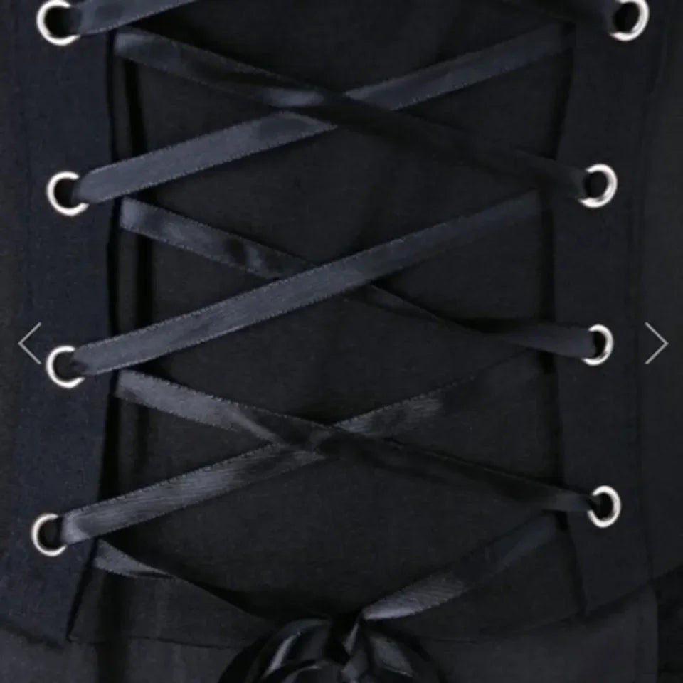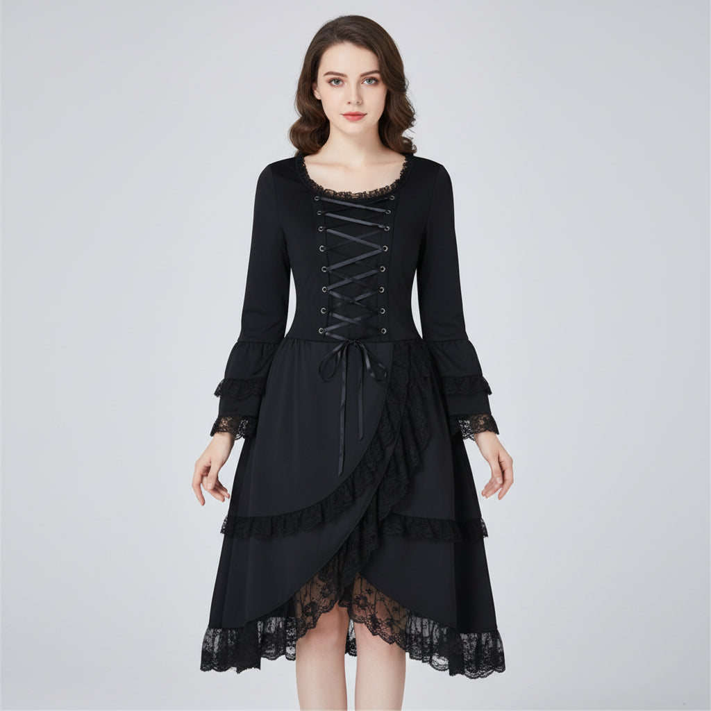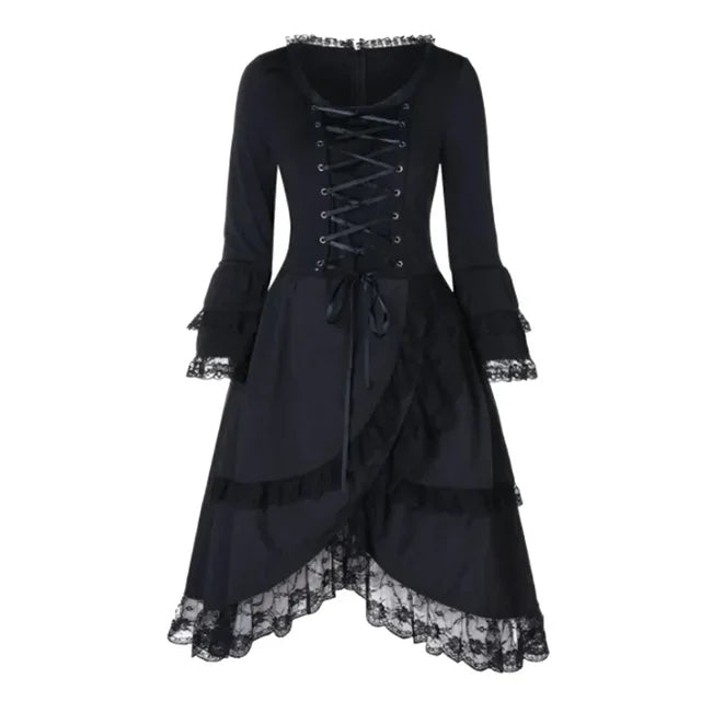 Step into a vintage, gothic-inspired world with this stunning black dress. Featuring delicate lace trim and a laced-up front, it evokes the perfect blend of Victorian and steampunk aesthetics. The full-length sleeves add a dramatic touch, while the fabric ensures comfort and breathability. This dress is ideal for anyone looking to add a bit of romance and mystery to their wardrobe. Perfect for themed parties, festivals, or as a unique addition to any collection of gothic attire.