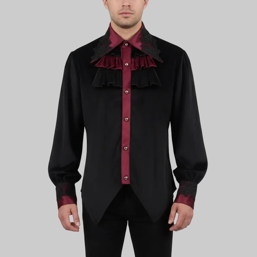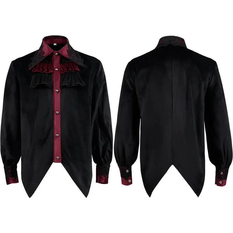 This elegant black steampunk shirt captures the essence of Victorian and gothic fashion through its refined details and dramatic structure. The ruffled chest design adds depth and theatrical flair, while the contrast burgundy accents elevate its visual richness. Crafted for men who appreciate historical influences blended with modern wearability, this shirt delivers a commanding presence. Perfect for cosplay or statement outfits, it allows you to embody sophistication, mystery, and timeless alternative style.