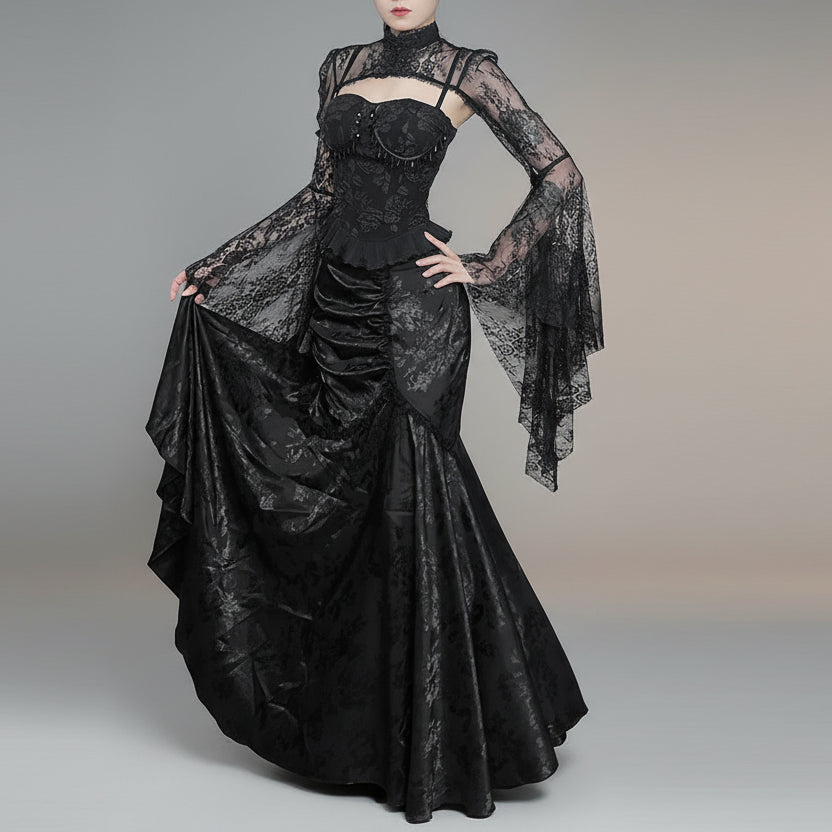 Step into gothic elegance with this high-waisted lace stitch mermaid skirt. Featuring a flattering trumpet silhouette, this skirt creates a dramatic yet graceful look. The lace detailing adds a delicate touch, making it perfect for gothic parties or themed events. The slight stretch fabric ensures comfort, while the ankle-length cut enhances the skirt’s elegant design. Whether you're attending a party or celebrating a special occasion, this skirt is sure to turn heads and elevate your gothic wardrobe.