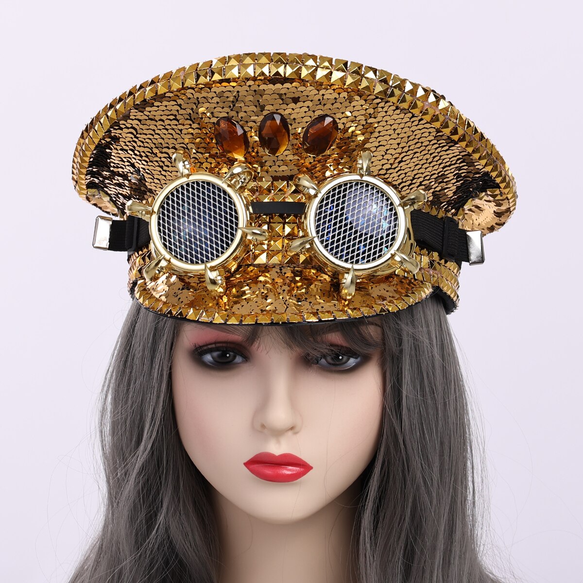 - Ultra-original hat : rhinestones and sequins, goggles