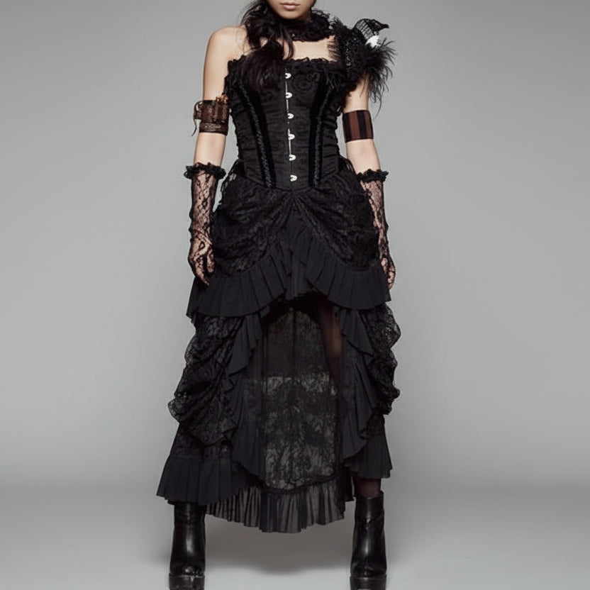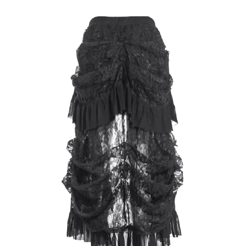 This stunning gothic bustle lace skirt combines the dramatic flair of a high-low hemline with the romantic elegance of lace and ruffles. Perfect for standing out at any event, from punk gatherings to Halloween costumes, this skirt offers a flattering A-line silhouette that complements any gothic or Victorian-inspired outfit.