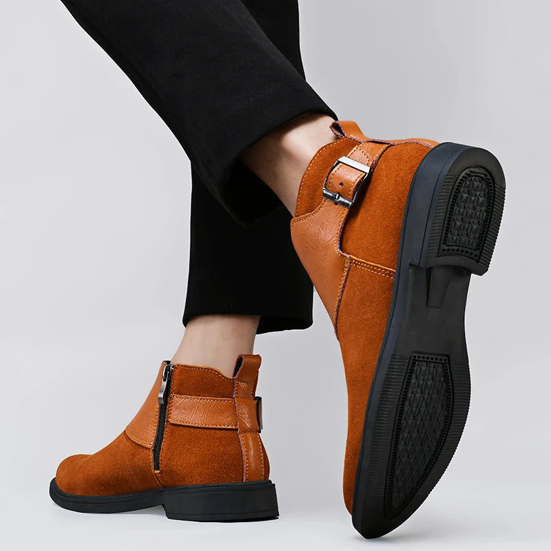 These high-quality steampunk ankle boots feature a clean retro design enhanced by subtle stitching and a sleek leather buckle detail. The blend of suede and smooth split leather creates visual depth while maintaining a polished appearance. Designed to sit perfectly at the ankle, they pair effortlessly with business trousers or casual outfits. Their minimalist structure highlights craftsmanship, making these boots a reliable choice for men who value understated elegance with character.