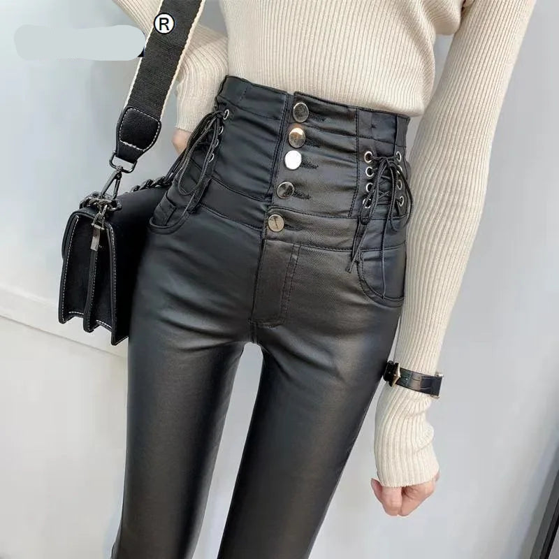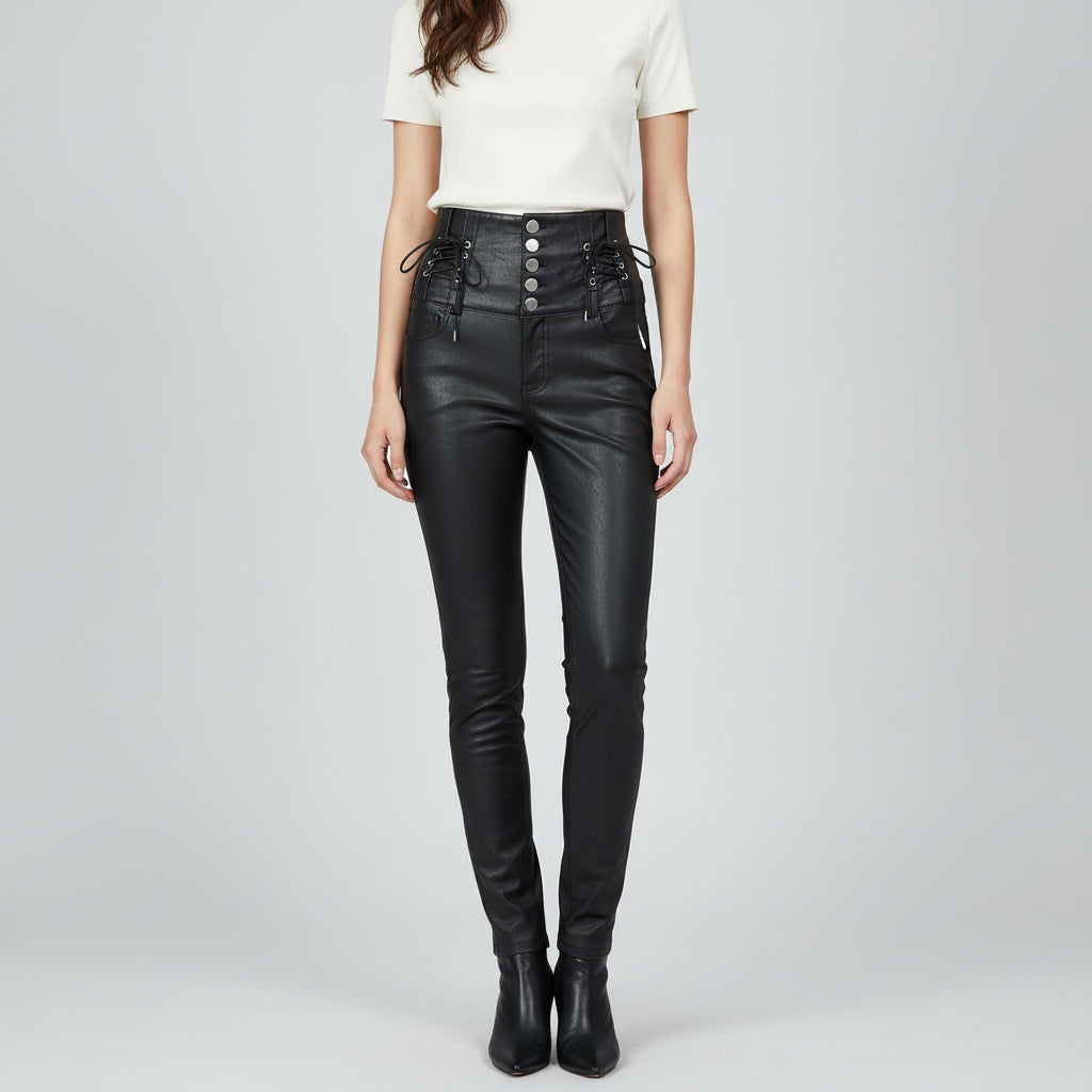 - Define your silhouette with high-waisted faux leather pants designed to sculpt and empower.