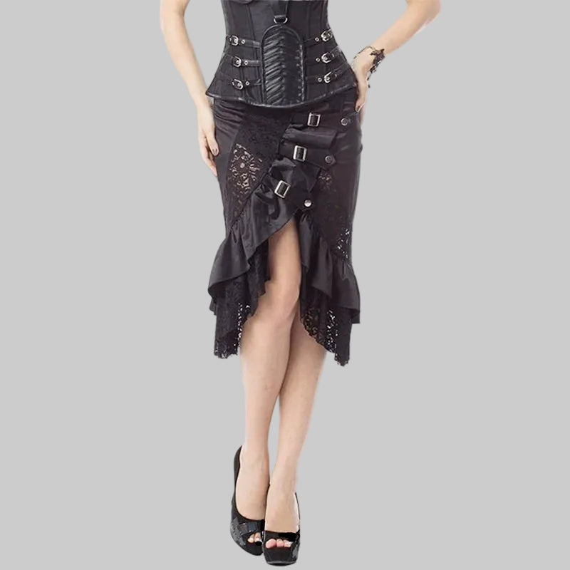 This irregular gothic steampunk skirt is the perfect piece for anyone who loves mixing bold, edgy designs with classic feminine details. The asymmetrical cut brings drama to the outfit, while the delicate lace trim softens the punk rock vibe. Designed with a high waist, it flatters your silhouette and adds a vintage touch to your wardrobe. Perfect for those looking to embrace a gothic or steampunk style, this skirt is sure to make a statement at any event.