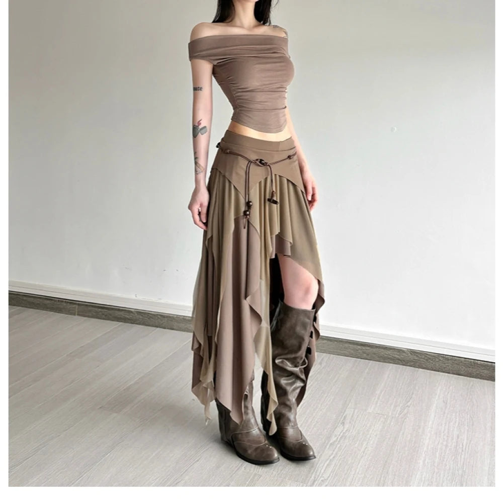 - Elevate your casual look with this chic irregular hem khaki skirt. Perfect for both day and night occasions.