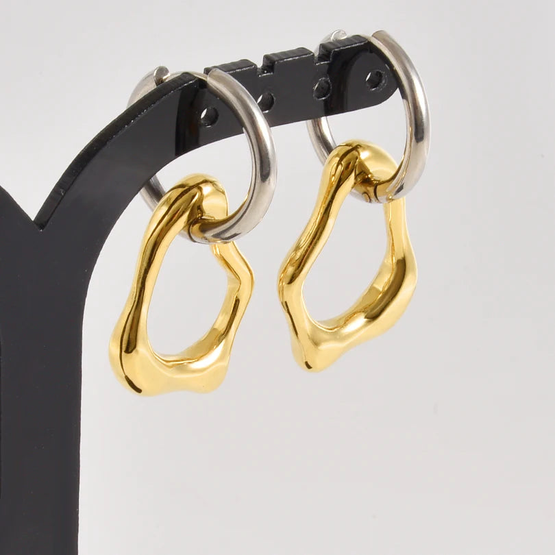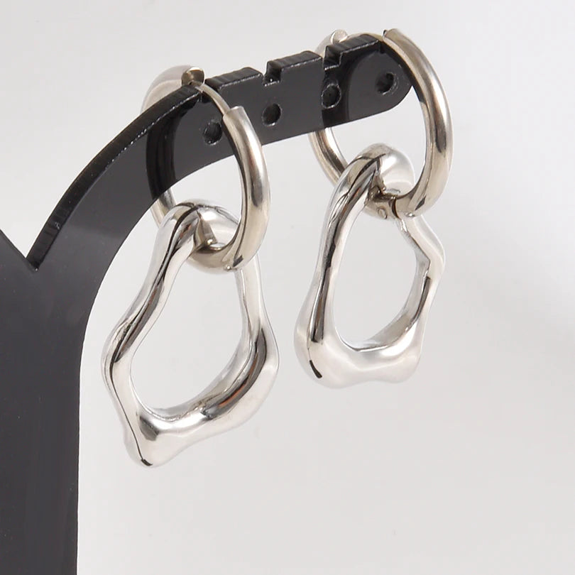 These earrings stand out with pendants shaped by free-flowing, wavy contours that create an unexpected organic silhouette. Suspended from a smooth metallic hoop, they play on the contrast between a classic circular structure and a contemporary fluid form. The polished surface gently catches the light, highlighting the irregular textures and subtle relief. The overall design offers a delicate balance between minimalist modernity and reimagined industrial inspiration.