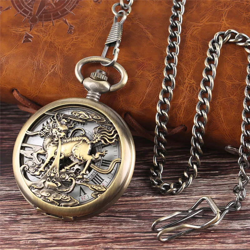 The Kylin Carving Steampunk Pocket Watch features the powerful qilin, a mythical creature symbolizing protection and prosperity. Its finely sculpted case showcases meticulous craftsmanship that blends Eastern aesthetics with retro-futuristic mechanical design. Perfect for legend enthusiasts, Steampunk lovers, or collectors of unique objects, it instantly captures attention. An ideal watch to display elegance, mystery, and spirituality with an unforgettable visual presence.
