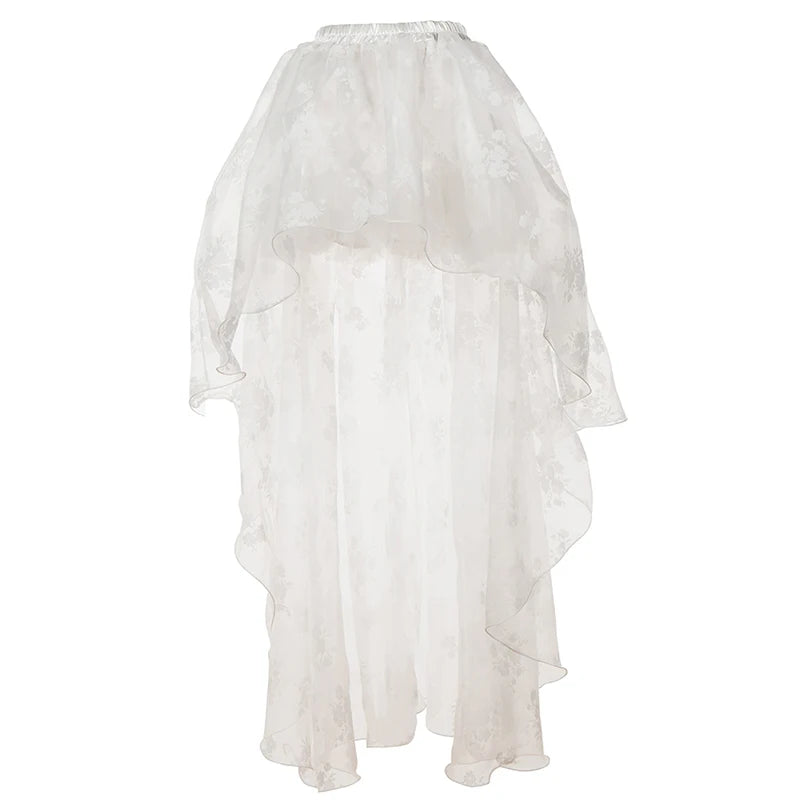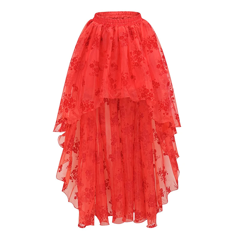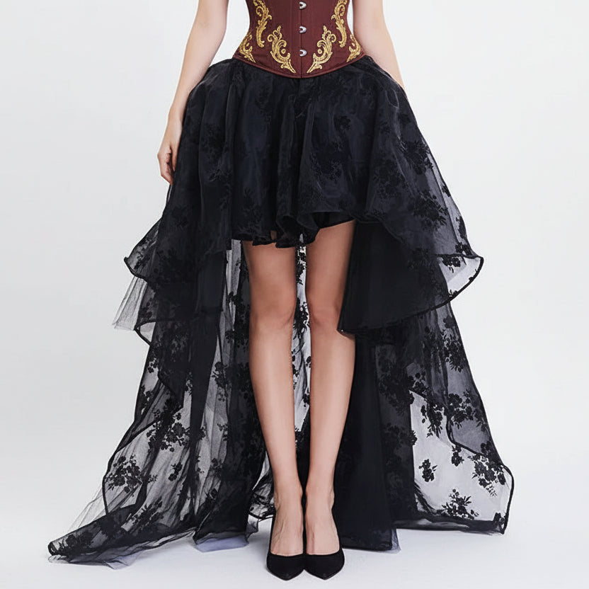 This lightweight floral steampunk skirt is the epitome of Victorian-inspired style with a modern twist. Featuring a bold red floral design and an asymmetrical mesh structure, the skirt creates a striking contrast that enhances any steampunk or gothic outfit. Whether worn to a party or a cosplay event, its unique look will turn heads and bring a vintage charm to your wardrobe.