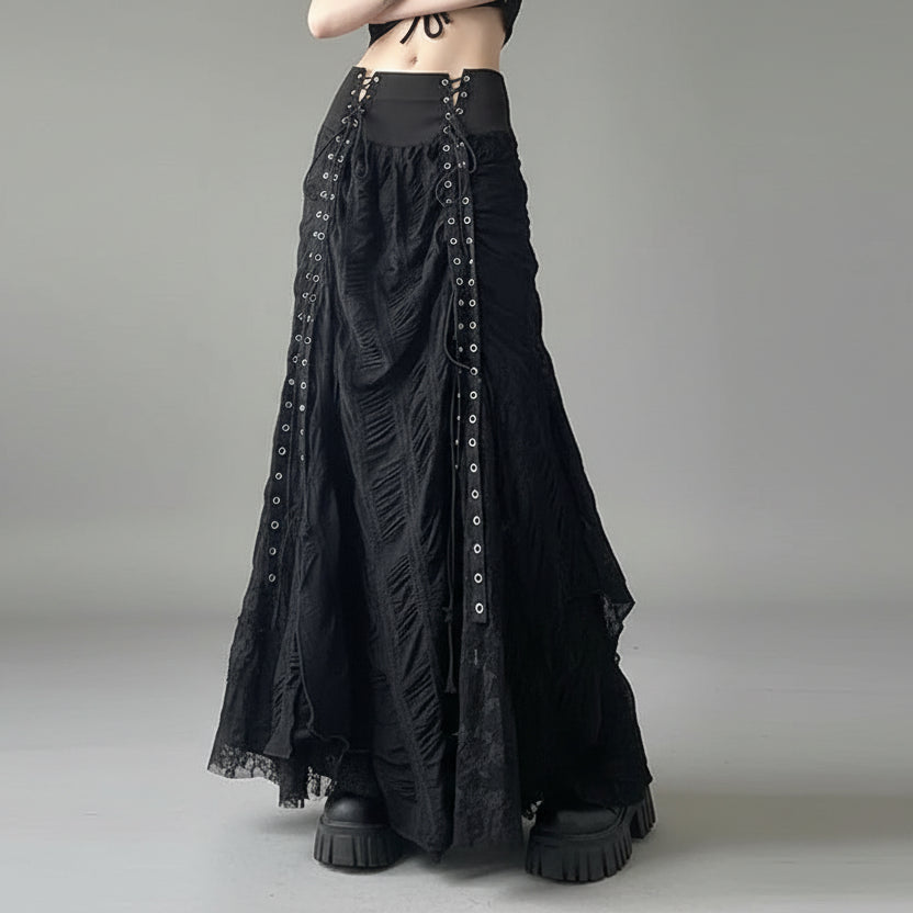 Crafted from lace and mesh fabrics, this skirt features a rich layered construction that adds depth and motion. The irregular panels and ruched details create a striking visual effect while keeping the skirt lightweight and breathable. The dark aesthetic pairs perfectly with crop tops, corsets, or boots, making it a versatile piece for gothic wardrobes. Designed to stand out, this skirt delivers both comfort and strong visual impact.