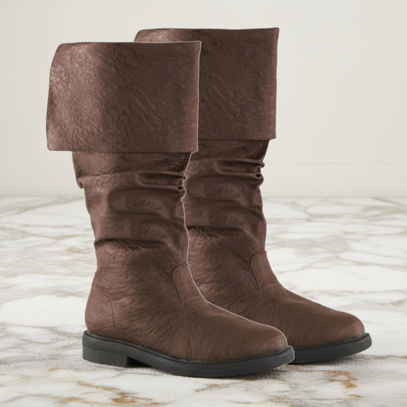 These medieval pirate steampunk boots are designed to capture the spirit of legendary seafarers and historical warriors. The tall leather shaft with a folded cuff creates a dramatic silhouette that reflects classic pirate and renaissance footwear. Rich textures and natural creases enhance the vintage aesthetic, making each pair visually striking. Ideal for cosplay, larp or themed performances, these boots bring depth, realism and character to any historical or fantasy costume.