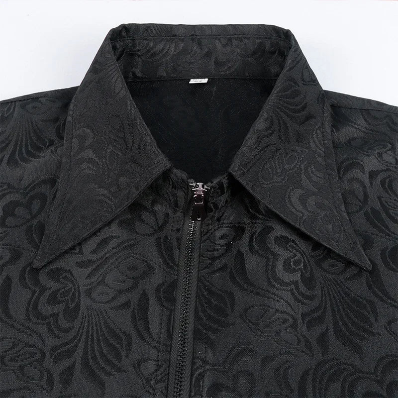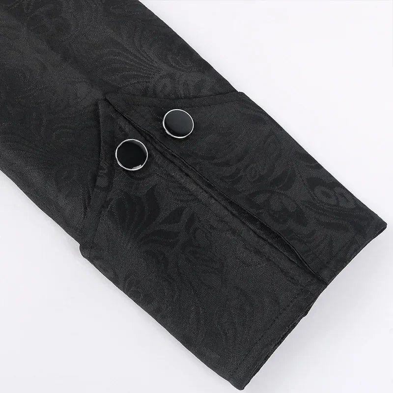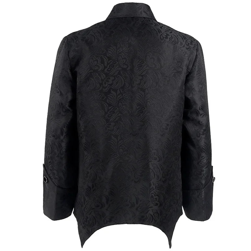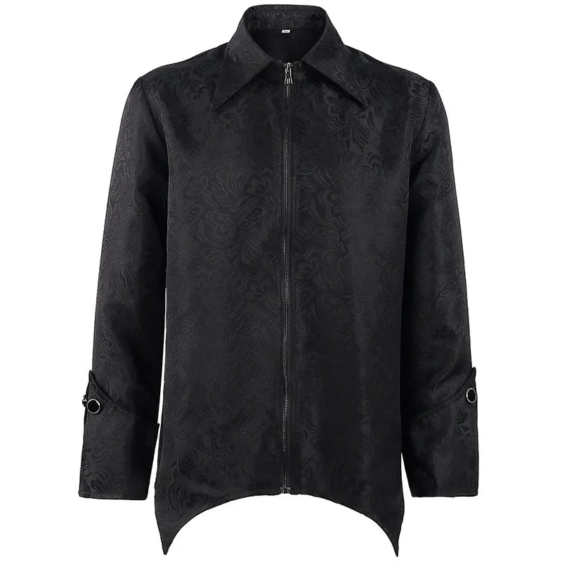 Crafted for those who embrace dark aesthetics, this jacket delivers a strong gothic presence with refined details. The floral jacquard pattern adds sophistication, while the long sleeves and curved hem enhance its medieval character. Easy to wear thanks to the zip-up front, it works perfectly for cosplay, Halloween, or statement outfits. This jacket is designed to express individuality, combining historical inspiration with modern wearability.