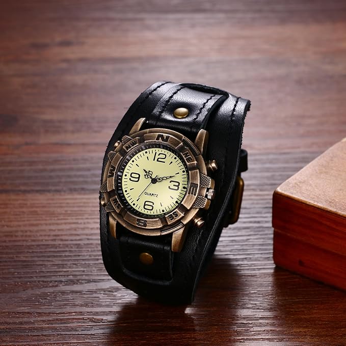 This men’s retro steampunk watch is crafted for those who refuse to blend in. Its oversized leather wristband and industrial-inspired dial create a rugged yet refined aesthetic that elevates any outfit. The combination of bold proportions and vintage detailing delivers a powerful visual impact while remaining functional for daily use. Designed to balance character and comfort, this watch becomes more than an accessory—it becomes a statement of individuality and confidence.