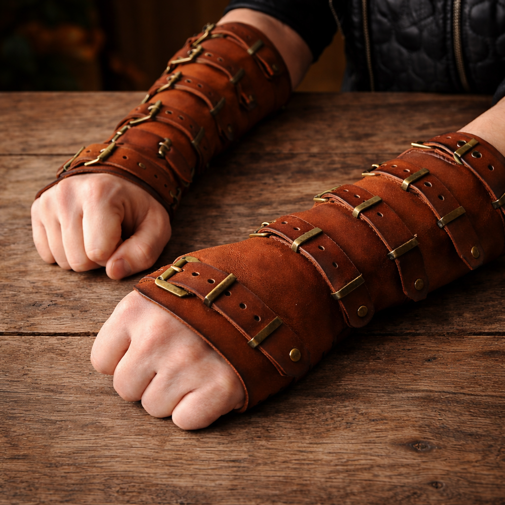 Steampunk Leather Gauntlets combine the nobility of finely crafted leather with the industrial aesthetics of retro-futurism. Their reinforced plates, sturdy stitching, and metallic accents create a strong yet elegant visual presence. Perfect for completing a Steampunk, medieval, or fantasy outfit, they bring power, refinement, and authenticity. An ideal accessory to express a bold, creative identity and fully immerse yourself in costumed worlds.