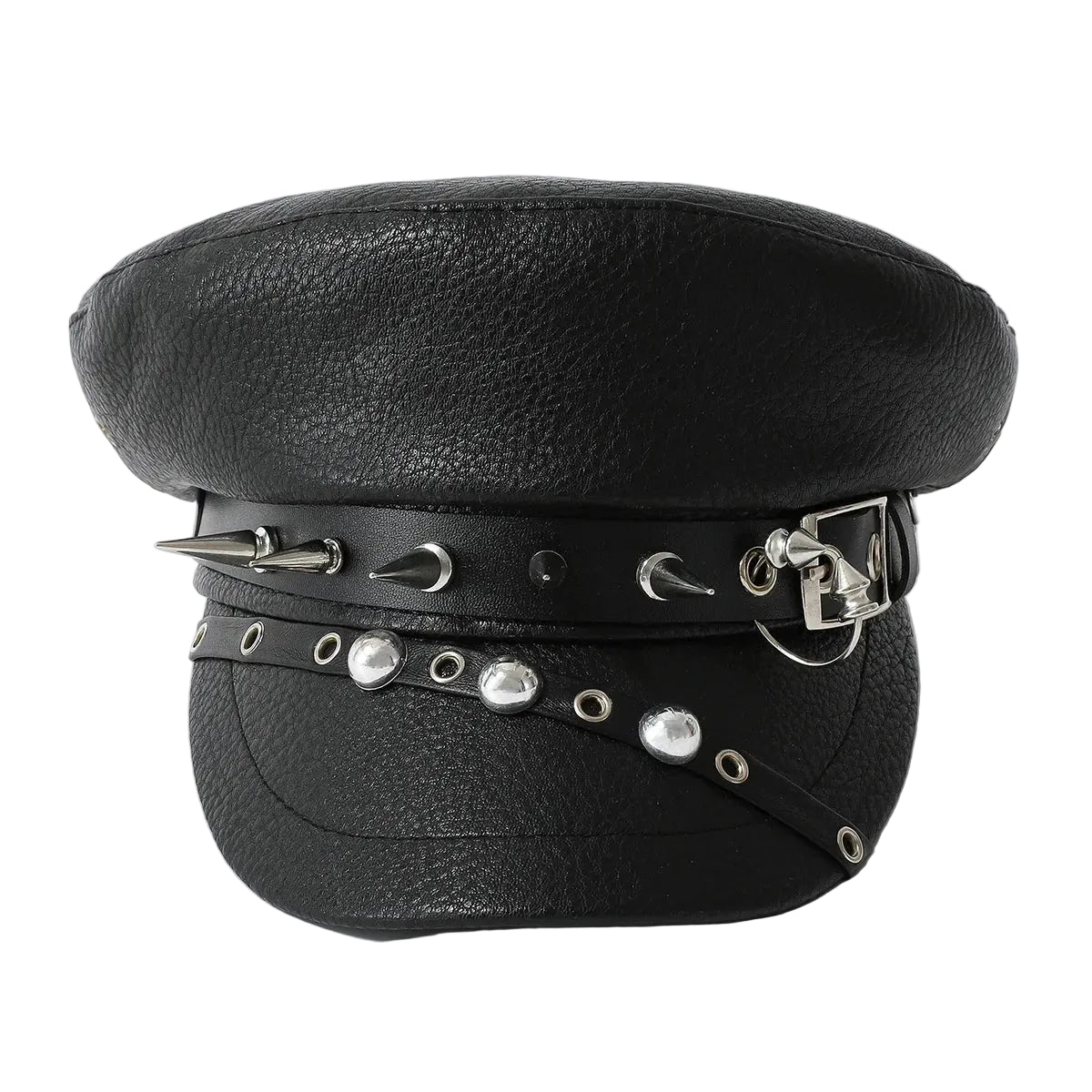- Design: Military-inspired steampunk cap featuring metal rivets, spikes, rings, and buckle accents