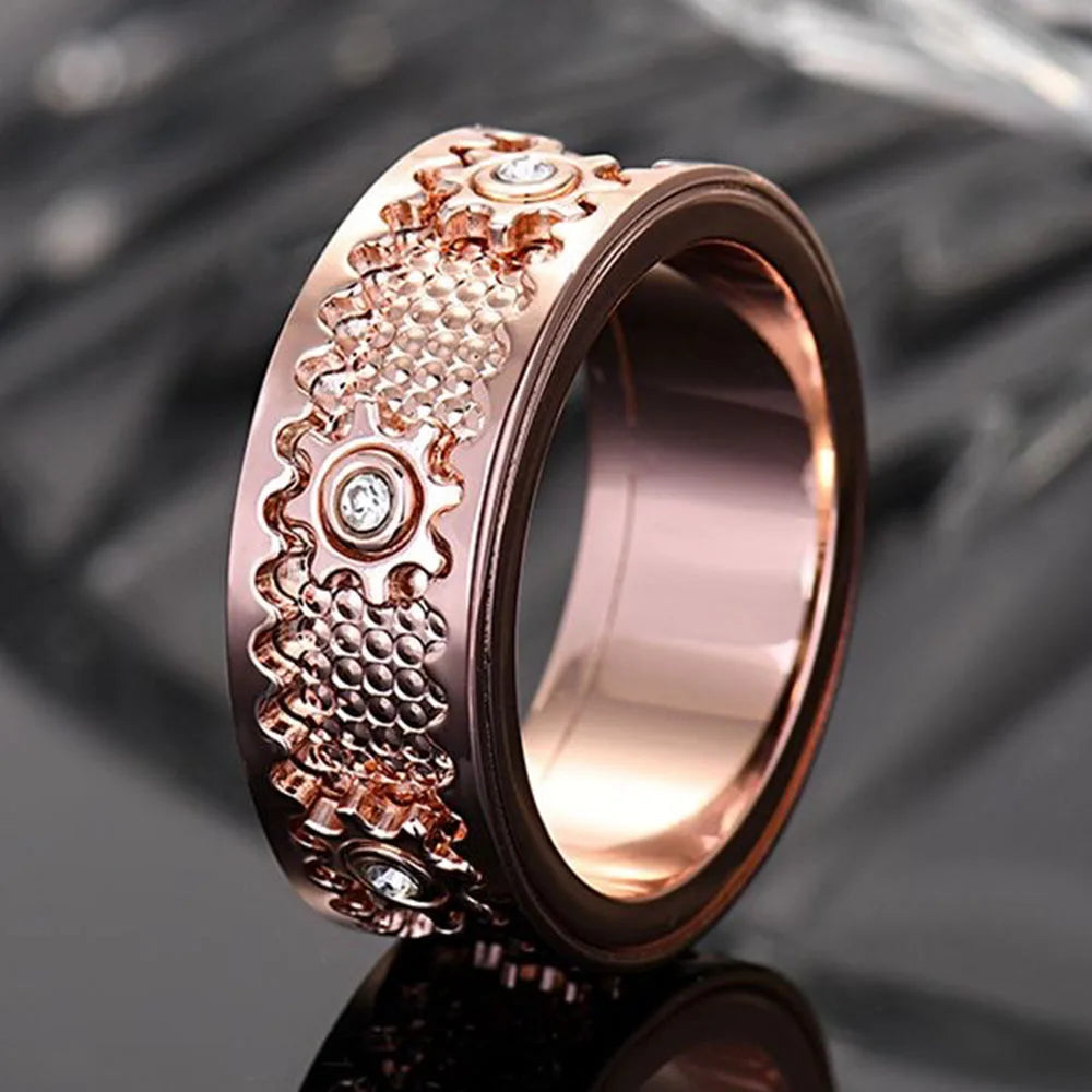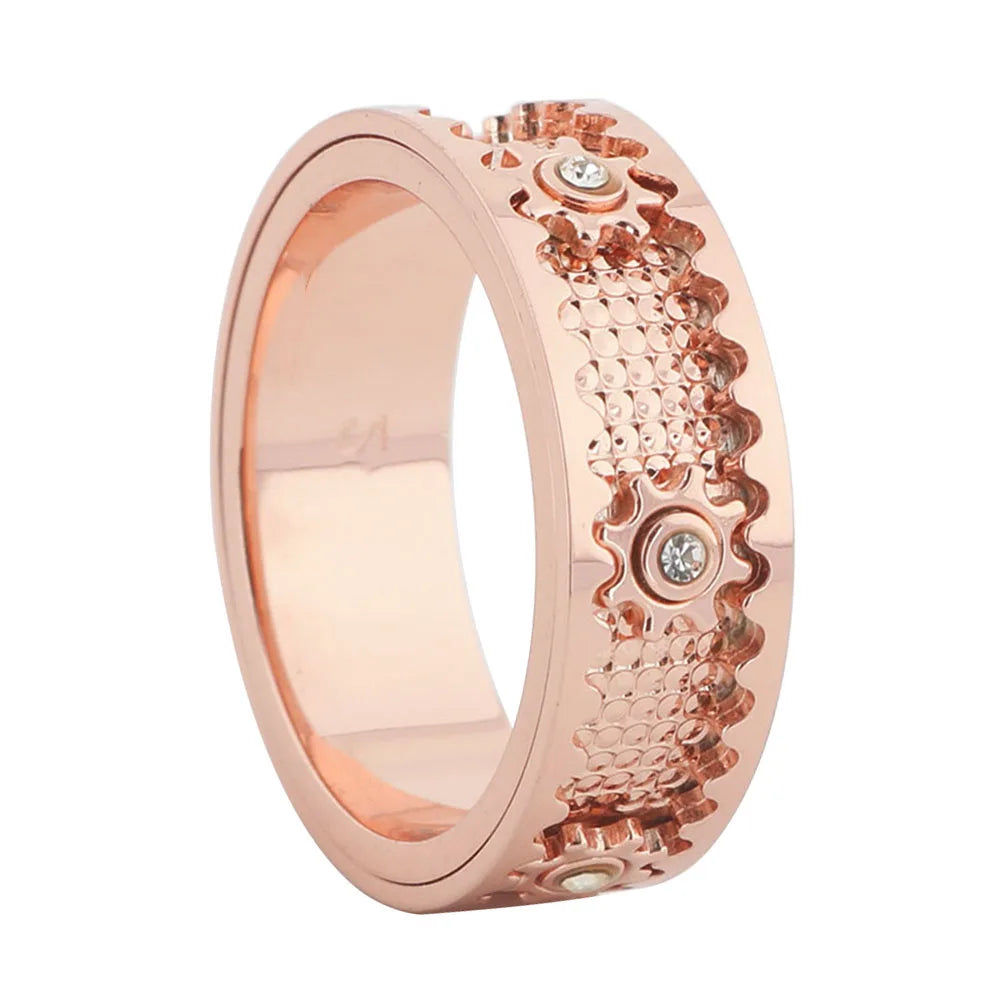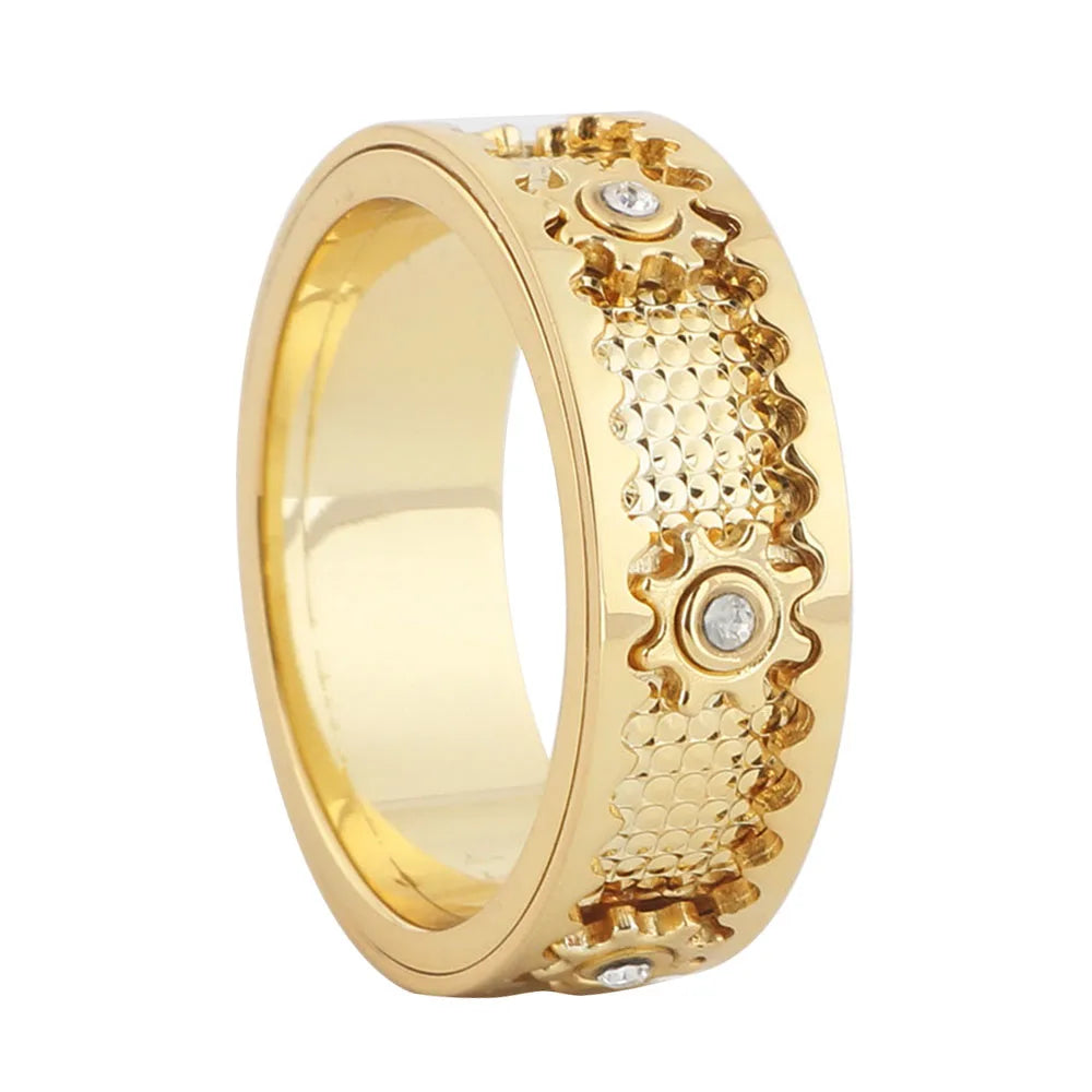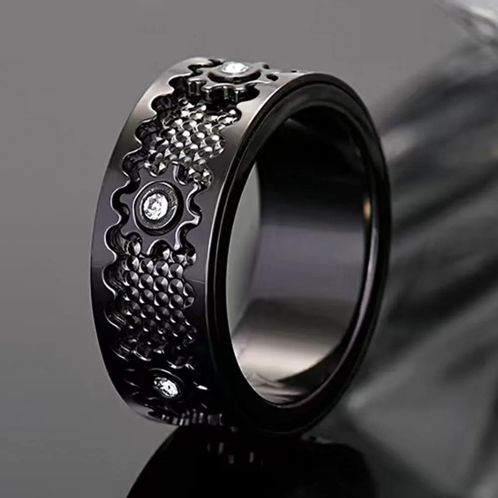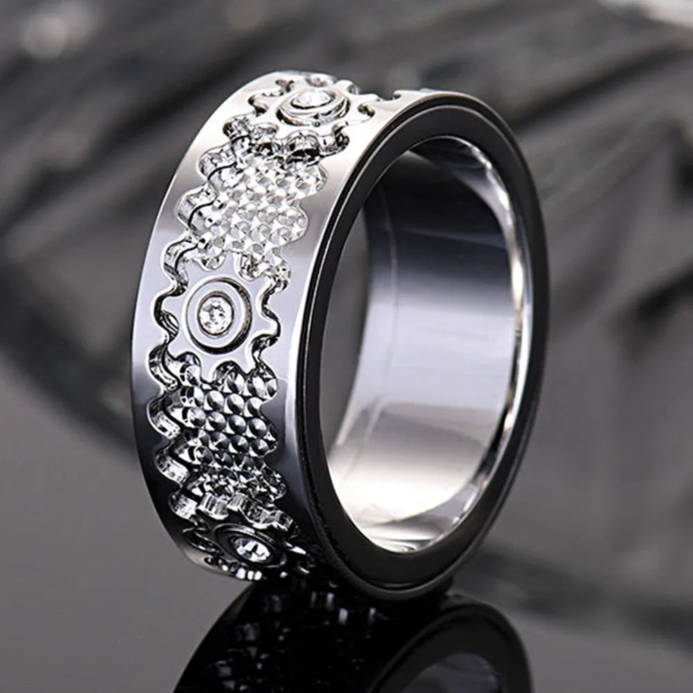 This steampunk-inspired ring combines clean lines with intricate mechanical detailing. The rotating gear element moves smoothly with a simple twist, offering a subtle yet satisfying tactile experience. Crafted with precision CNC technology, the 8 mm band maintains a balanced profile that feels substantial without being heavy. Its polished finish and embedded cubic zirconia accents create a refined contrast, making it suitable for both everyday wear and meaningful occasions.