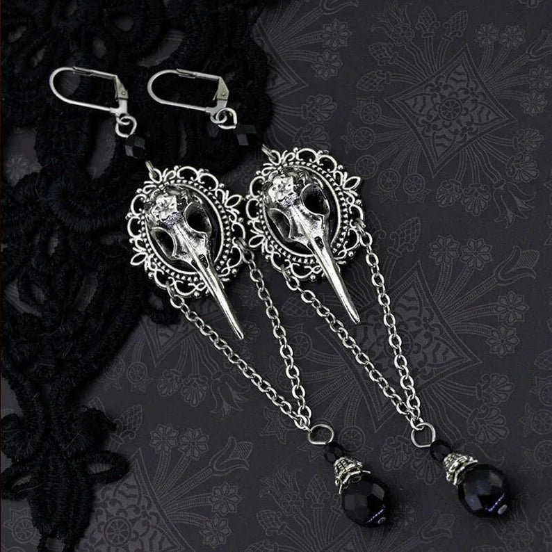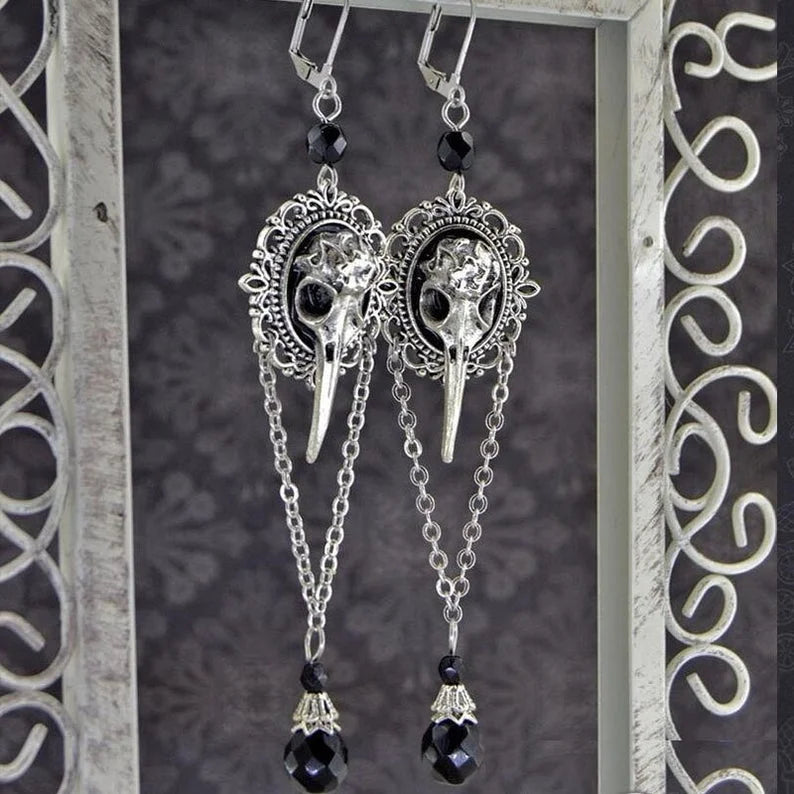 - Reveal your mysterious side with these raven skull dangle earrings inspired by gothic symbolism.