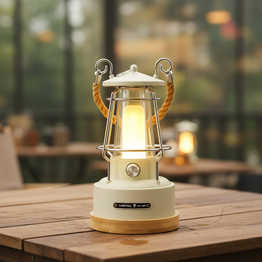 This rechargeable steampunk lantern combines vintage aesthetics with modern performance. Its bamboo base and woven rope handle create a warm and natural look, while the metal frame protects the light source. Designed for both indoor and outdoor use, it delivers a soft 360° illumination that enhances any atmosphere. The compact structure makes it easy to carry, while its elegant design transforms it into both a practical tool and a decorative element.